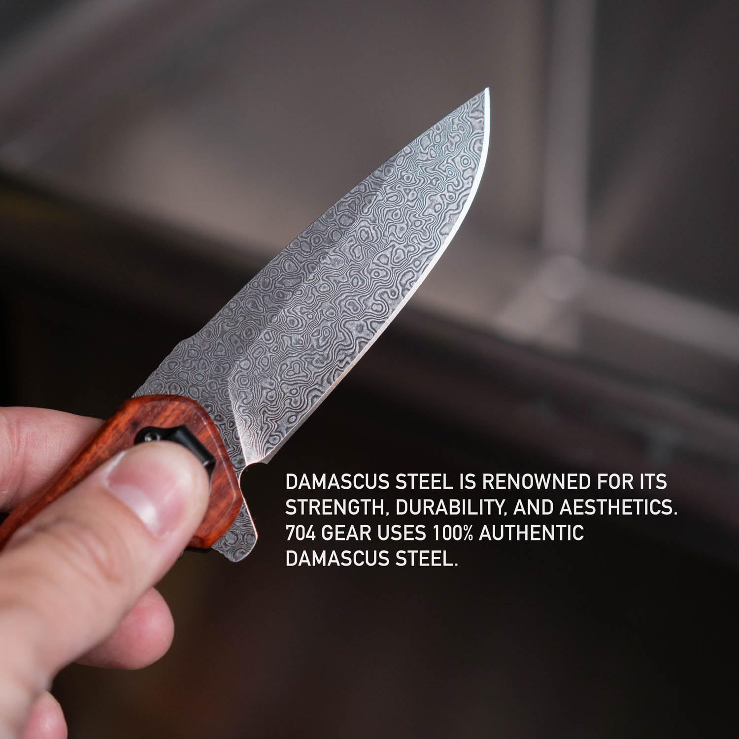 The blade is crafted from premium Damascus steel.