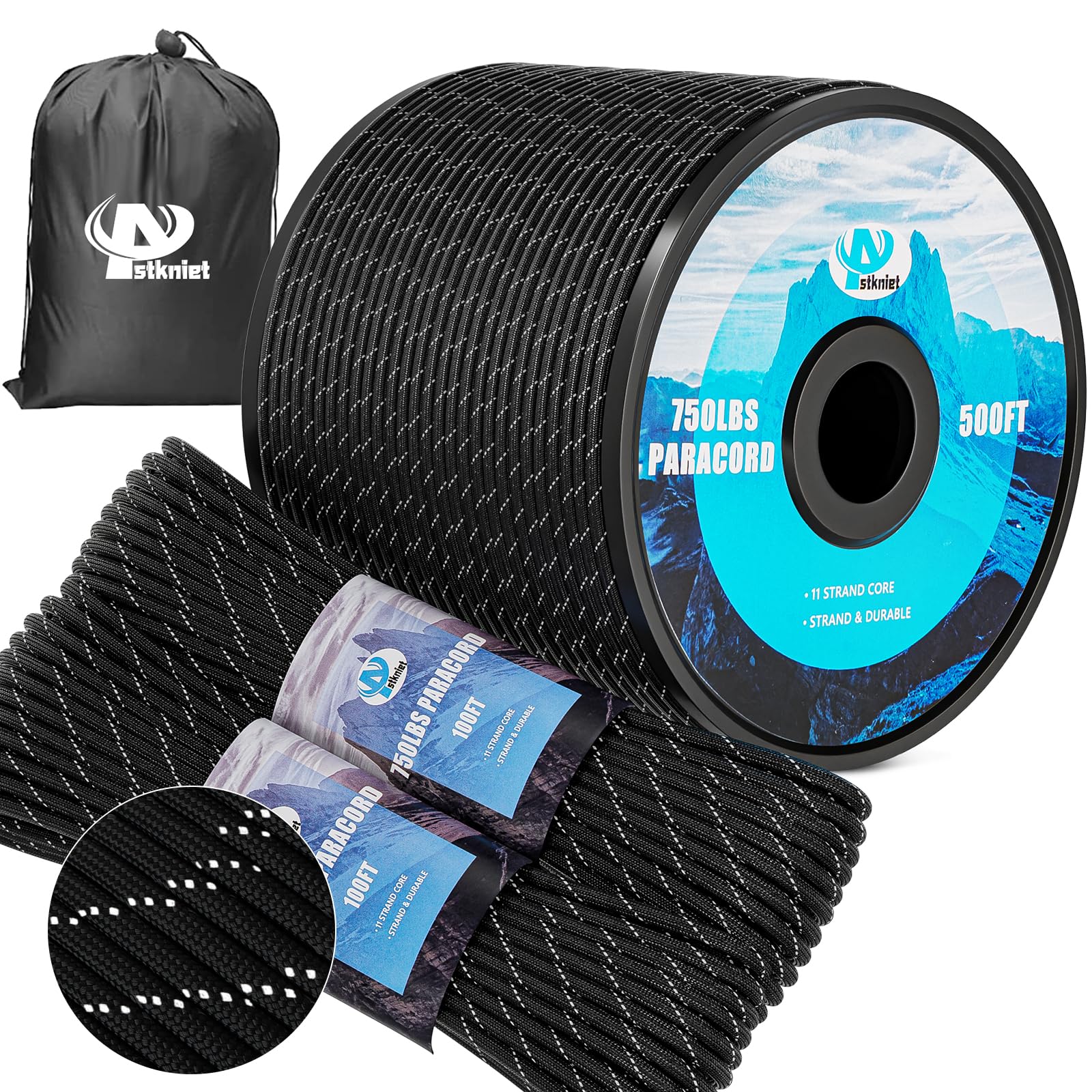 750Ib Reflective Paracord Rope,100',4mm 11 Strand Parachute Spool Cord with Collecting Bag, para Cord Lanyard for Clothsline, Hammock, Camping, Hiking and Survival