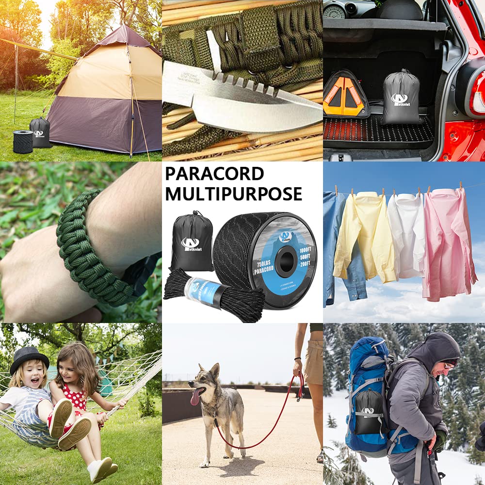 - MULTIPURPOSE REFLECTIVE ROPE - Versatility, flexibility and great strength of the black paracord makes it extremely multi-functional. It is used as a tent cord to set up tents, safely secure hammock or hang heavy items such as bikes and kayaks in your garage or basement. Serves as a rope in emergency situations. Ideal for crafting custom accessories: lanyards, bracelets, dog collars, keychains, belts, wrapping axes, knives, tools & other DIY projects.
