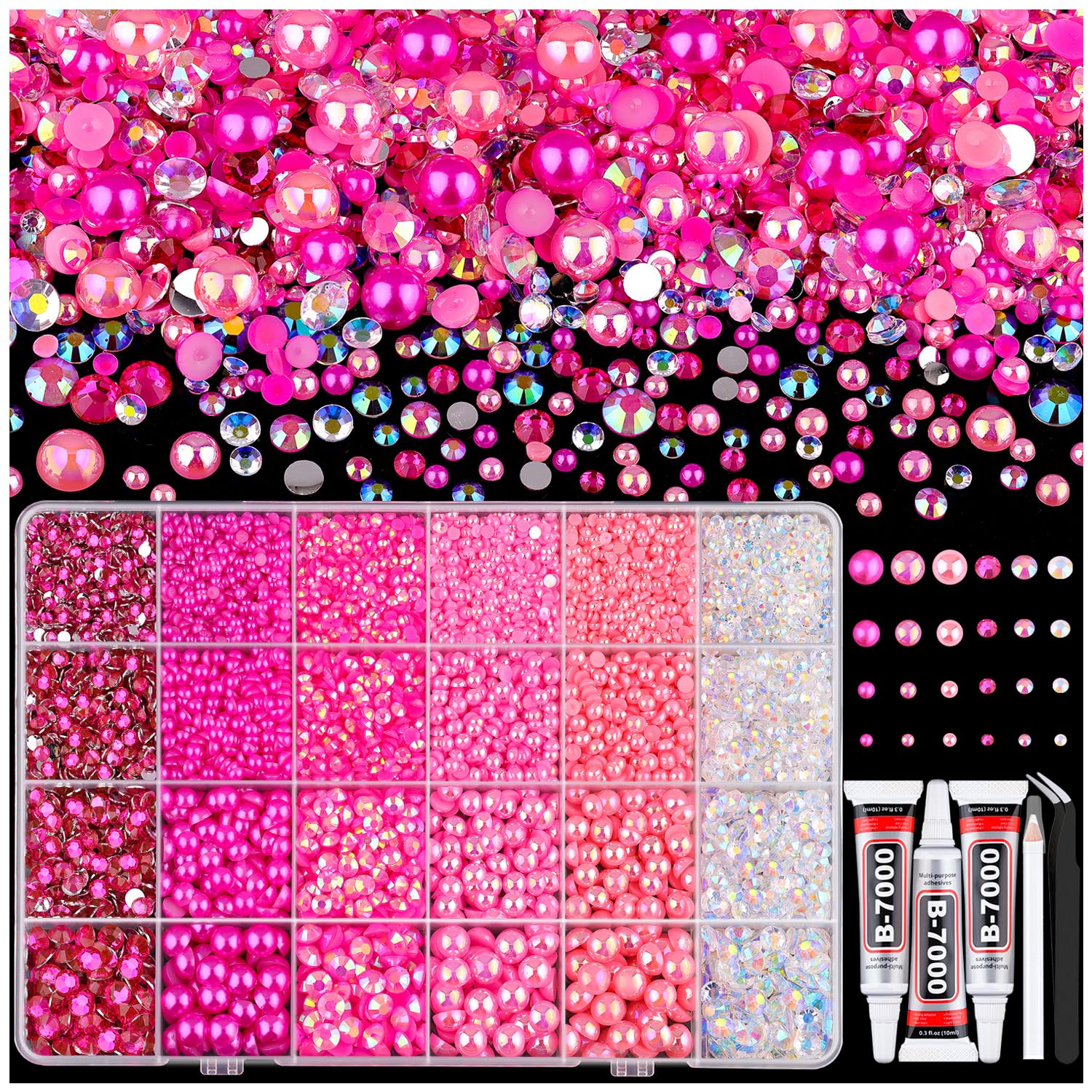 9000PCS Flatback Pearls and Rhinestones for Crafting, Dark Pink 3-10mm Resin Rhinestones and Half Pearls for Bedazzling, Nail Art and Dec with 3pcs B7000 Jewelry Glue, Tweezer and Pickup Pencil