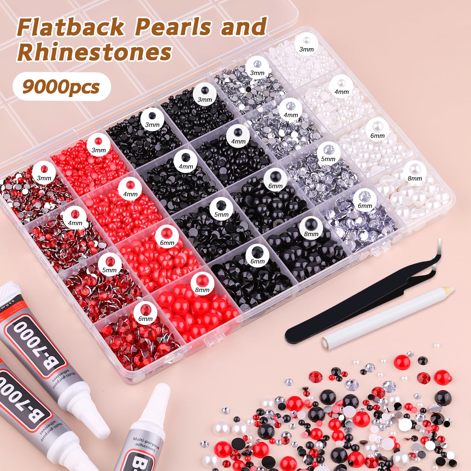 9000PCS Flatback Pearls and Rhinestones for Crafting, Red White Black 3-10mm Resin Rhinestones and Half Pearls for Bedazzling, Nail Art and Dec with 3pcs B7000 Jewelry Glue, Tweezer and Pickup Pencil