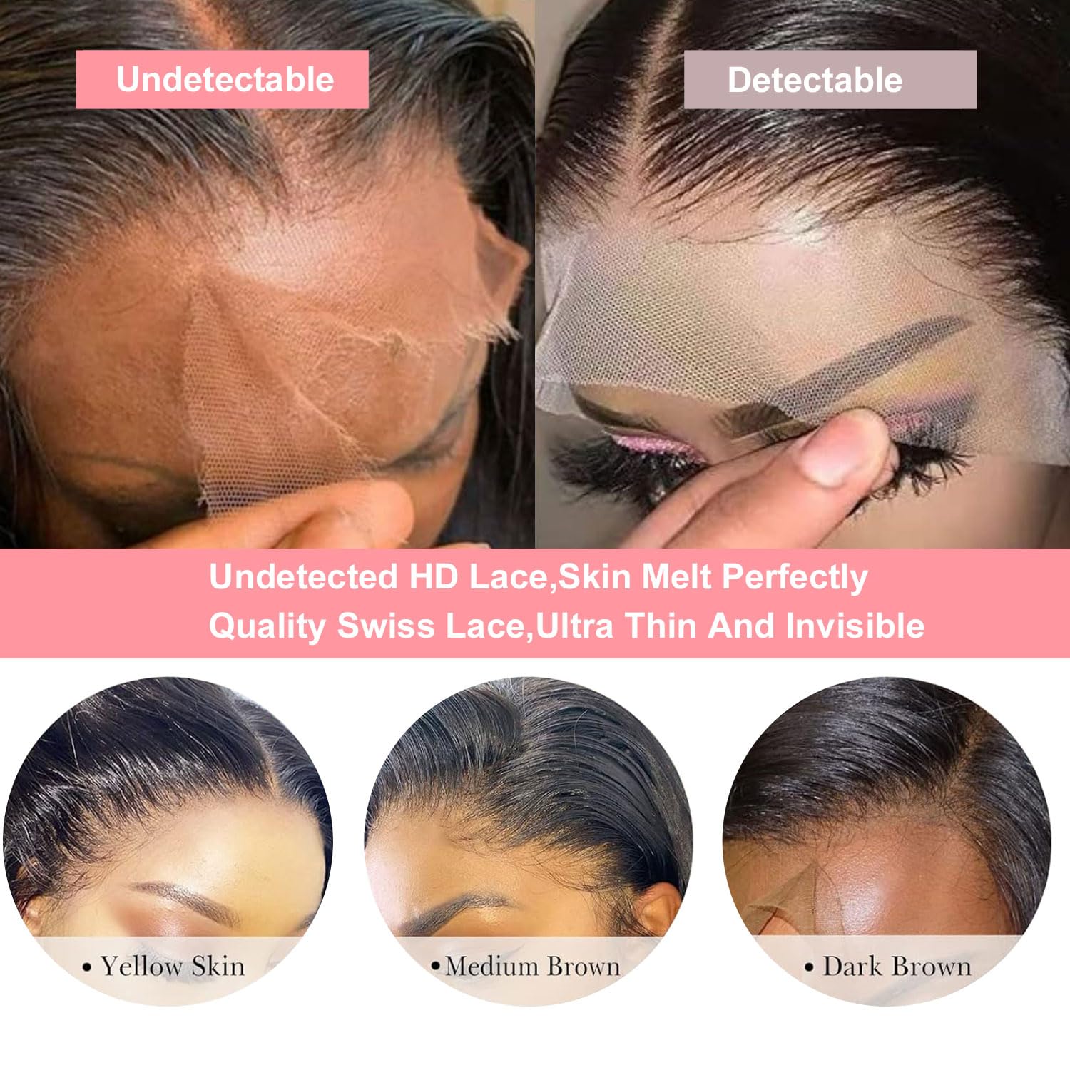 - HUMAN HAIR WIGS FOR BLACK WOMEN - Virtually undetectable lace front wigs human hair,Preplucked glueless hd lace front wigs human hair transparent, blends with most skin tones. Pre plucked with baby hair natural density hairline for a quick & effortless flawless/classic weave look. Ear-to-ear lace size with a wide 4” deep hand-tied parting area, can do middle part, side part easily. Body wave human hair wig comes free part