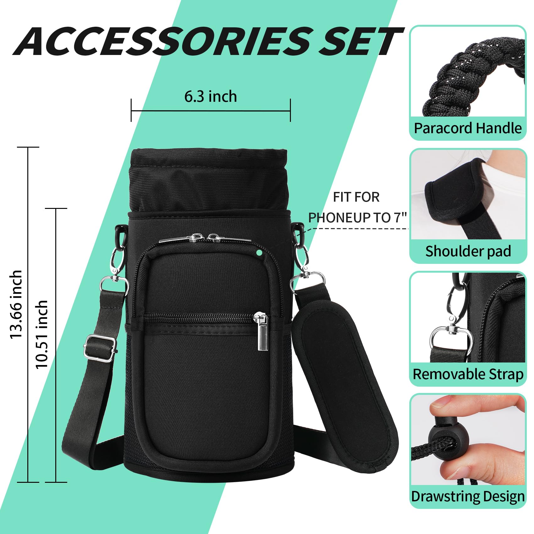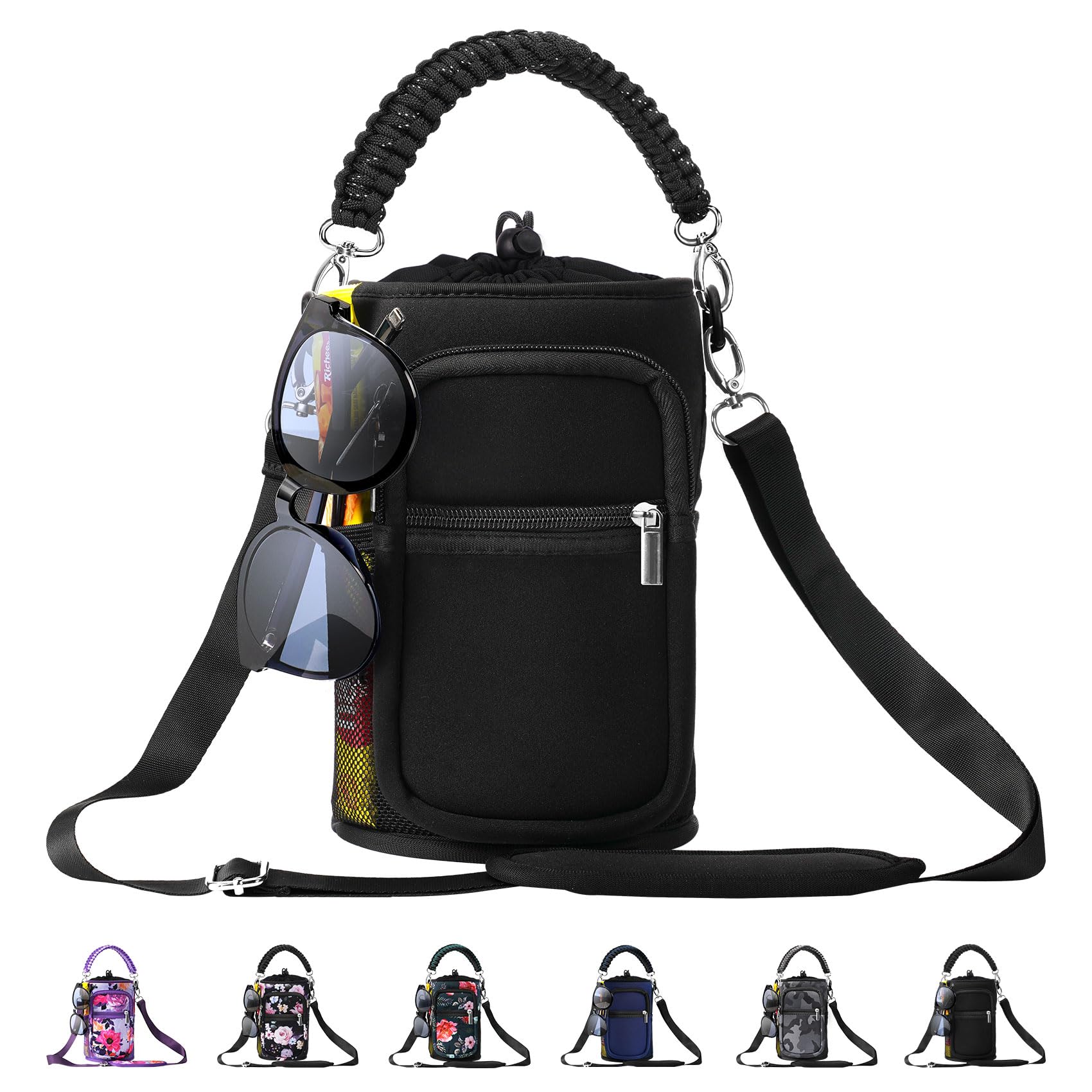 Details: This water bottle sleeve is designed to accommodate a range of water bottle sizes, from 16 to 128 oz, including thermal and plastic bottles. Constructed from durable neoprene, this carrier bag serves as a protective shield for your water bottle, enhancing its ability to maintain cold or hot temperatures. It's equipped with two zippered pockets for secure storage of your smartphone, credit cards, cash, and essentials, as well as two side mesh pockets ideal for stashing snacks. Additionally, it includes a paracord handle and shoulder strap for convenient bottle transport while on the move. Whether you're heading out for walking, hiking, gym session, or outdoor excursion, this bag ensures that your essentials and water bottle are always within easy reach.