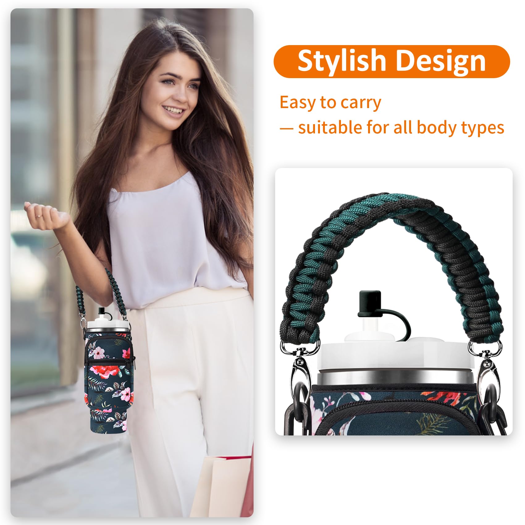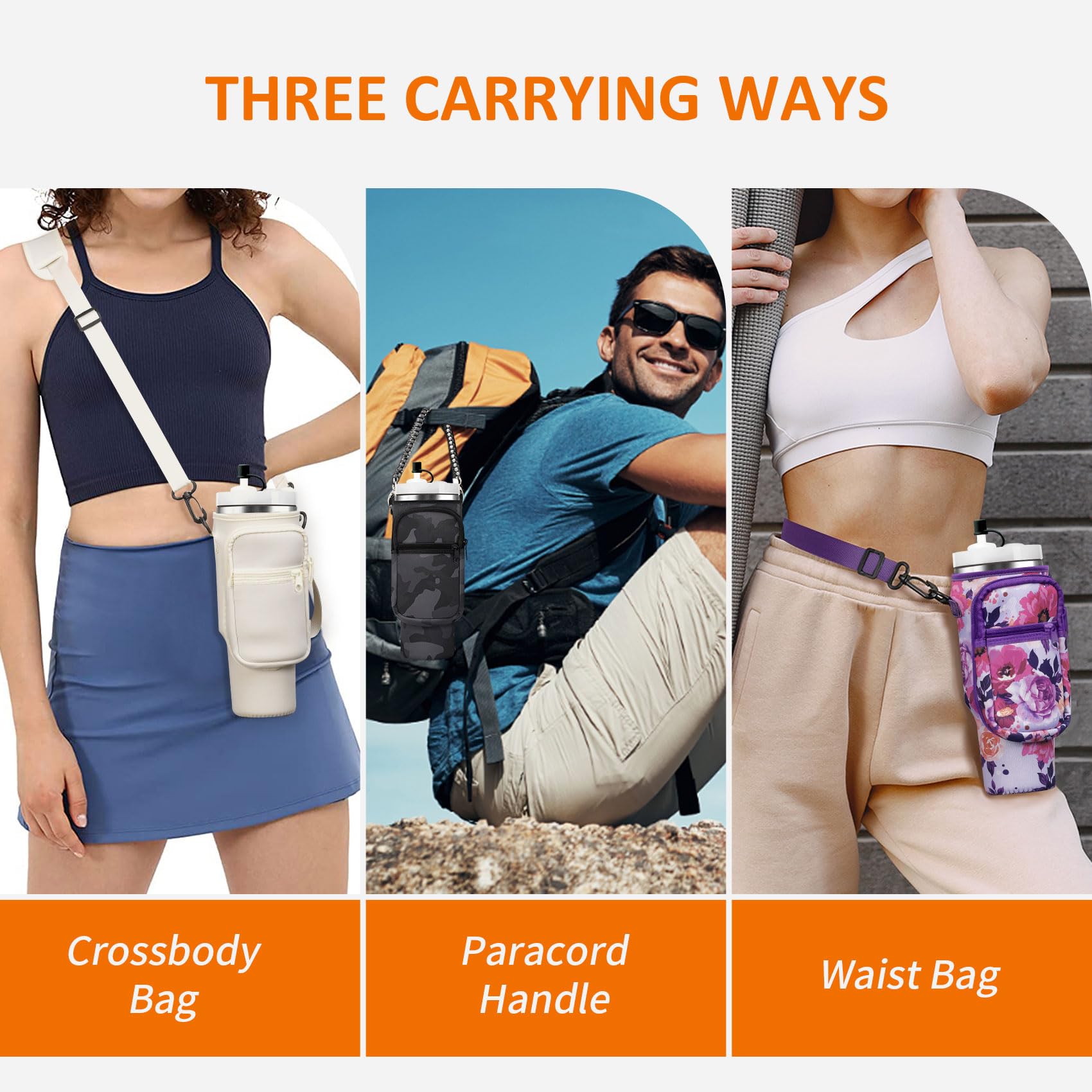 Details: This water bottle sleeve bag for Stanley accessories (40/30 oz) is made of high-quality neoprene material, ensuring superior insulation for your drinks while also protecting your cup from scratches. Equipped with a fashionable paracord handle and adjustable shoulder strap, you can take it on-the-go and stay hands-free, carrying it on your shoulder, across your body like a messenger bag, as a waist bag, or simply holding it in your hand. The two zipper pockets provide ample storage space for your phone, keys, cash, cards, earbuds, and other daily essentials. Additionally, the silicone straw cap is designed to keep your straw clean from dust and spills. Whether you're hiking, commuting, working in the office, or enjoying a day out shopping, this versatile sleeve bag is the perfect companion.