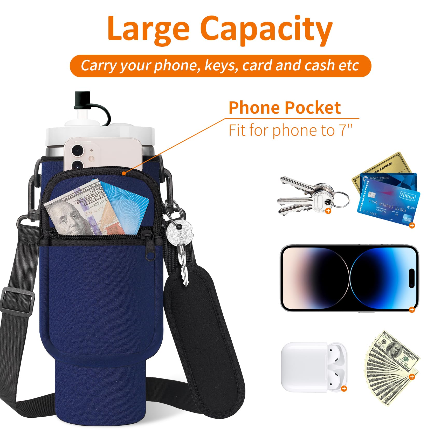 Details: This water bottle sleeve bag for Stanley accessories (40/30 oz) is made of high-quality neoprene material, ensuring superior insulation for your drinks while also protecting your cup from scratches. Equipped with a fashionable paracord handle and adjustable shoulder strap, you can take it on-the-go and stay hands-free, carrying it on your shoulder, across your body like a messenger bag, as a waist bag, or simply holding it in your hand. The two zipper pockets provide ample storage space for your phone, keys, cash, cards, earbuds, and other daily essentials. Additionally, the silicone straw cap is designed to keep your straw clean from dust and spills. Whether you're hiking, commuting, working in the office, or enjoying a day out shopping, this versatile sleeve bag is the perfect companion.