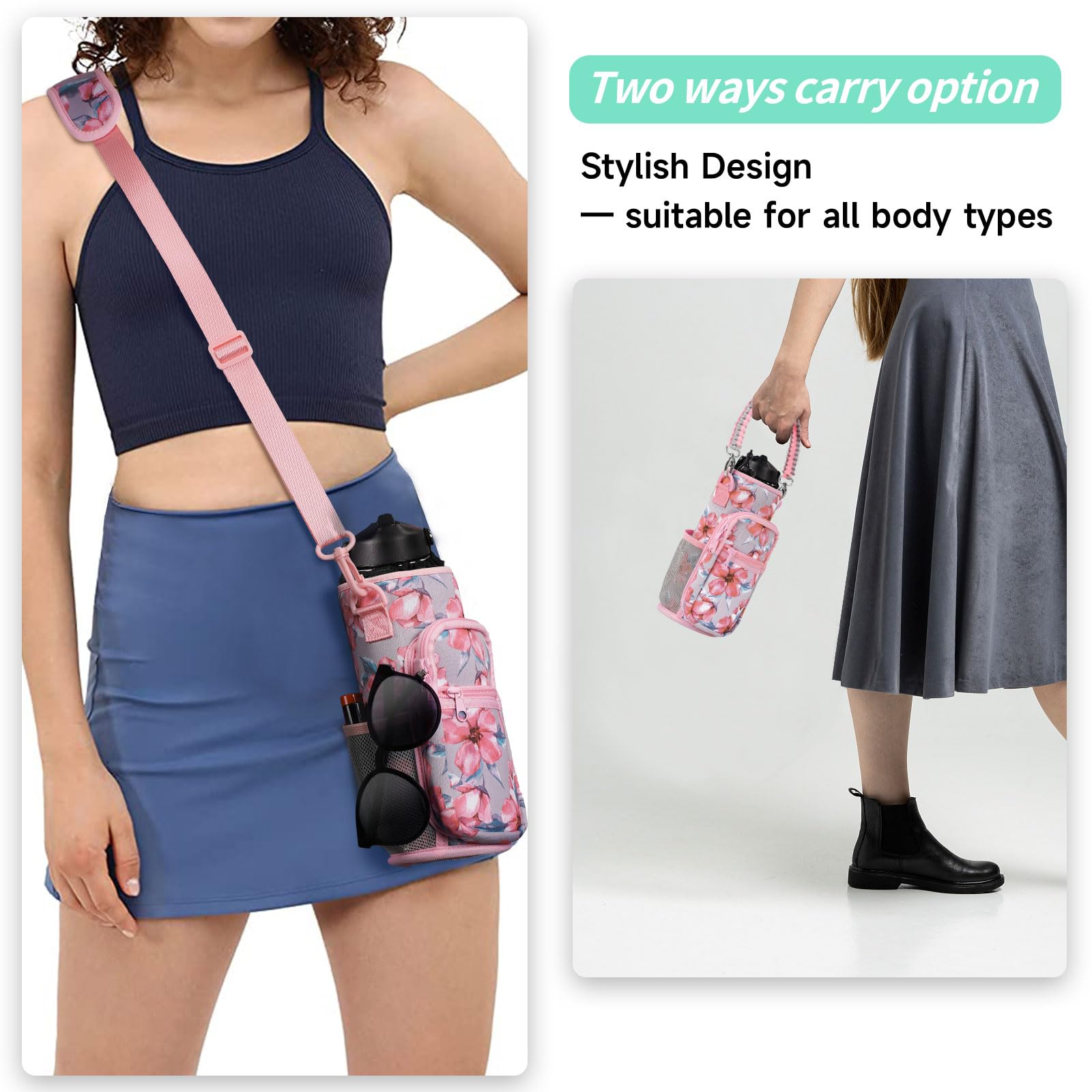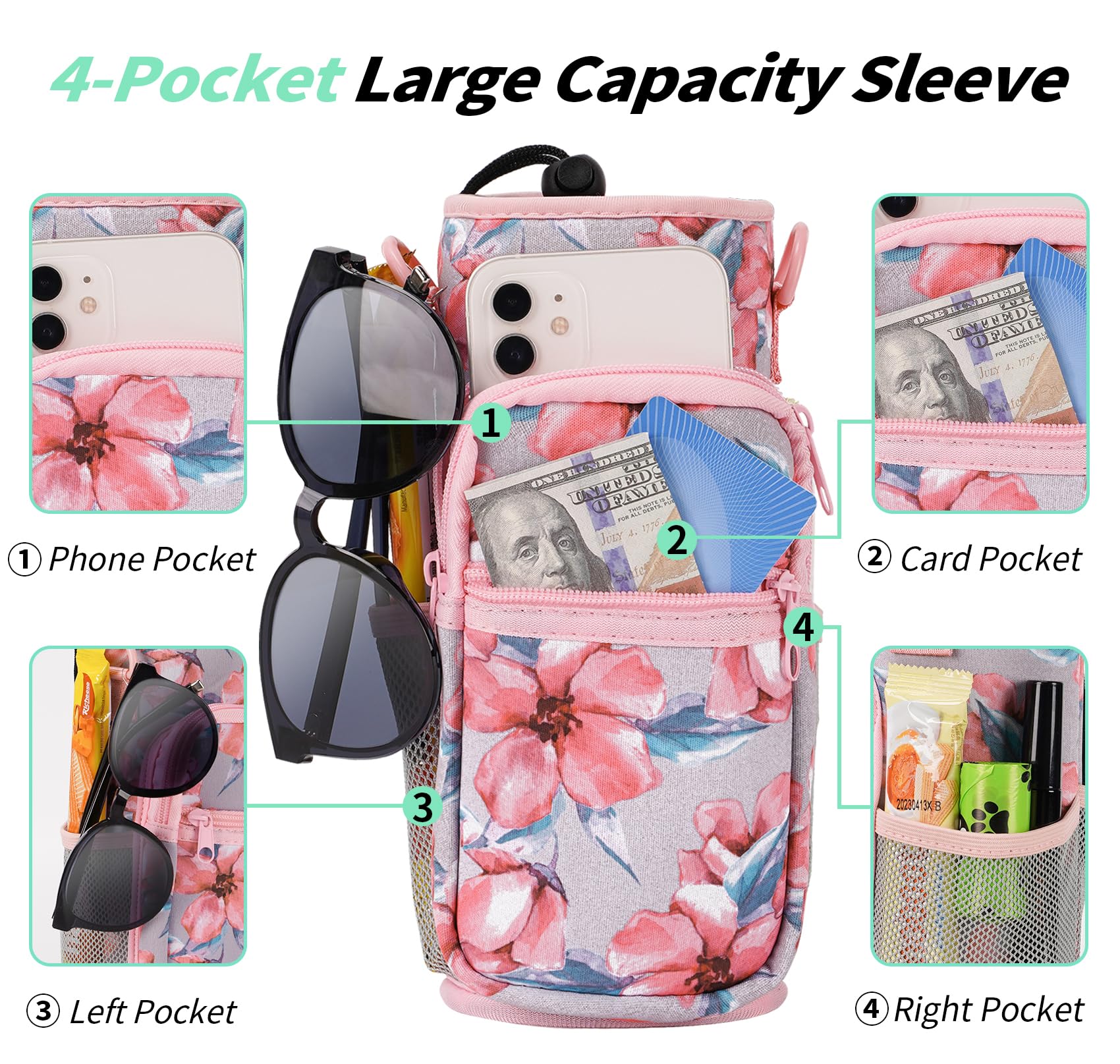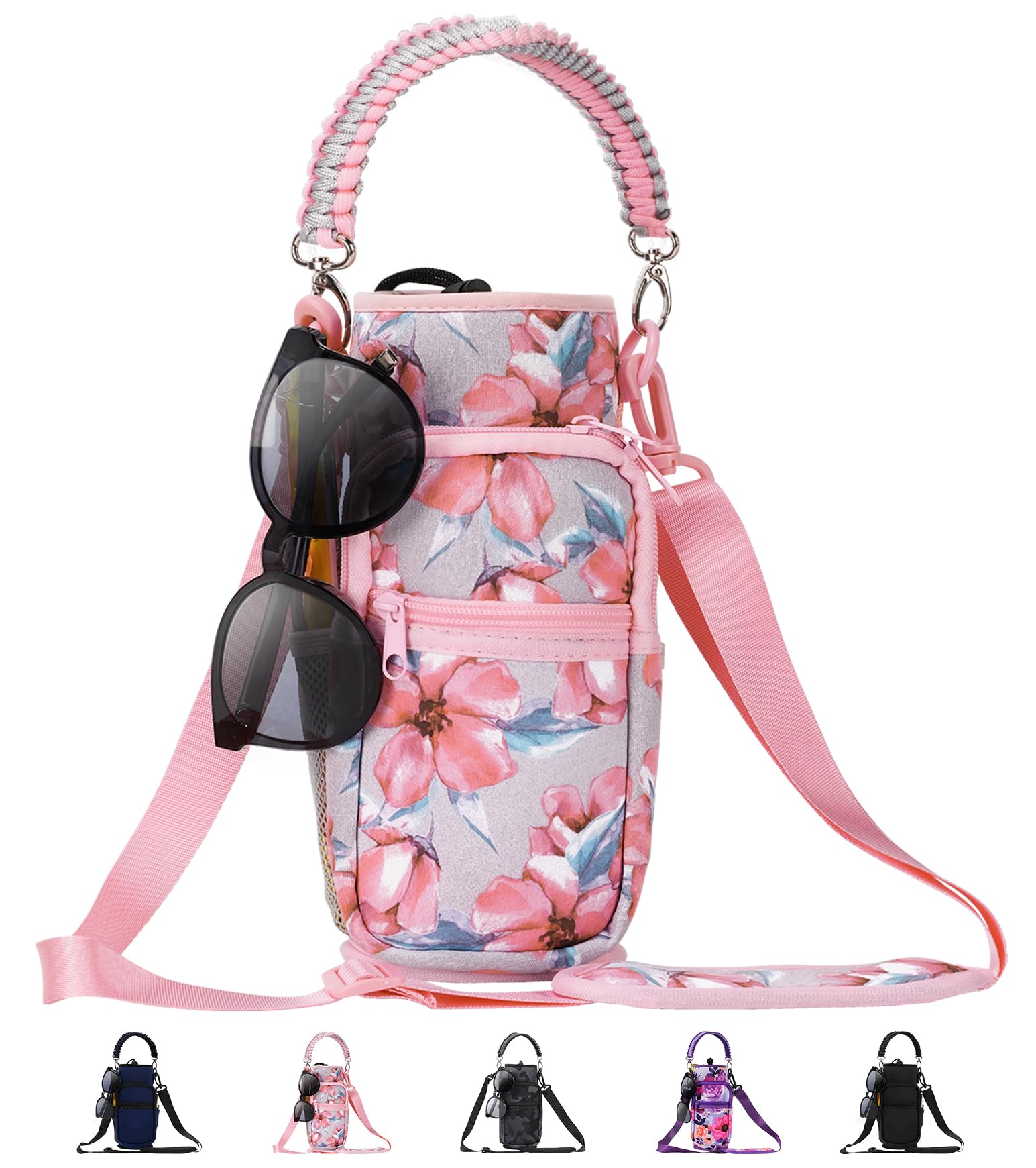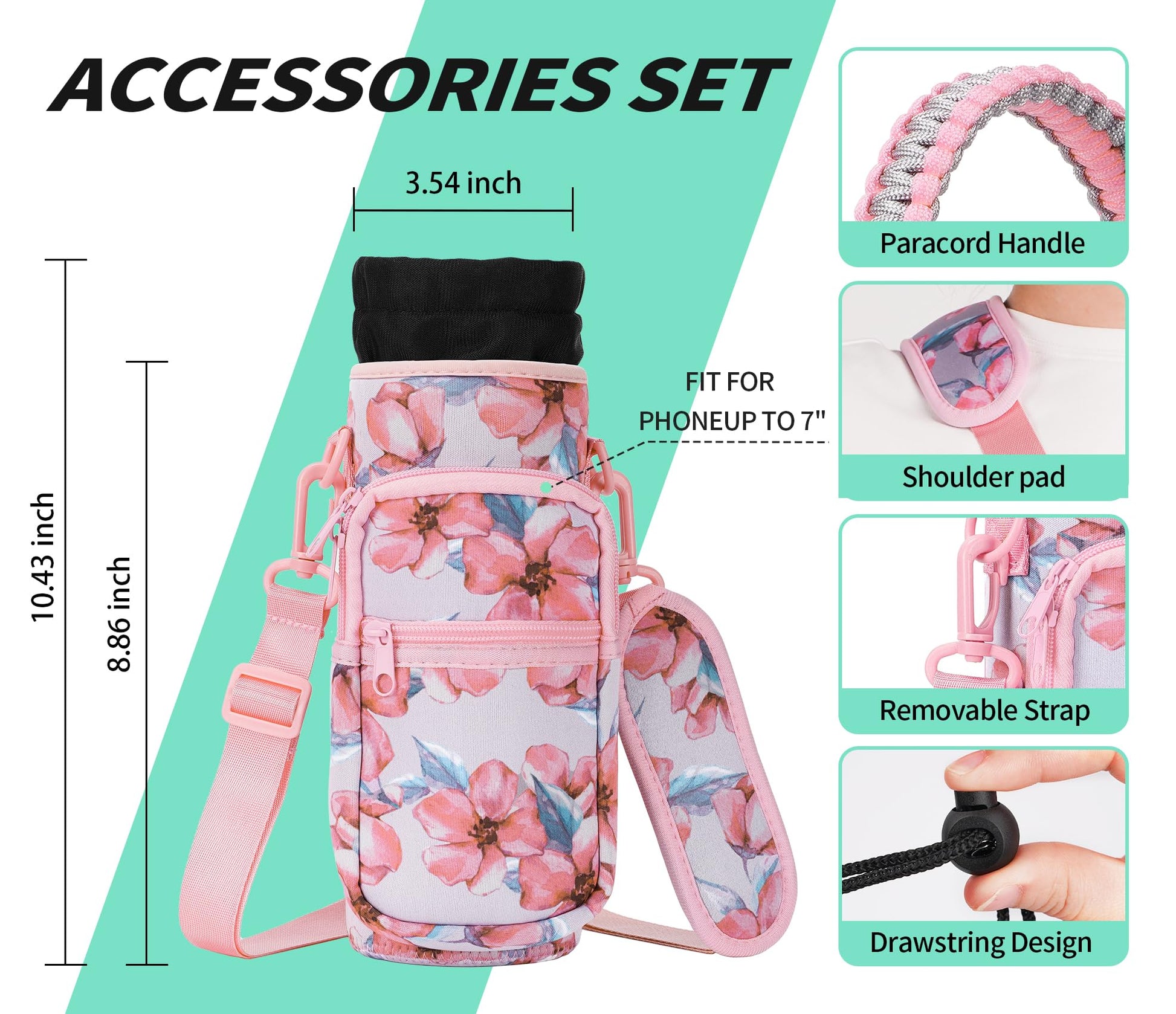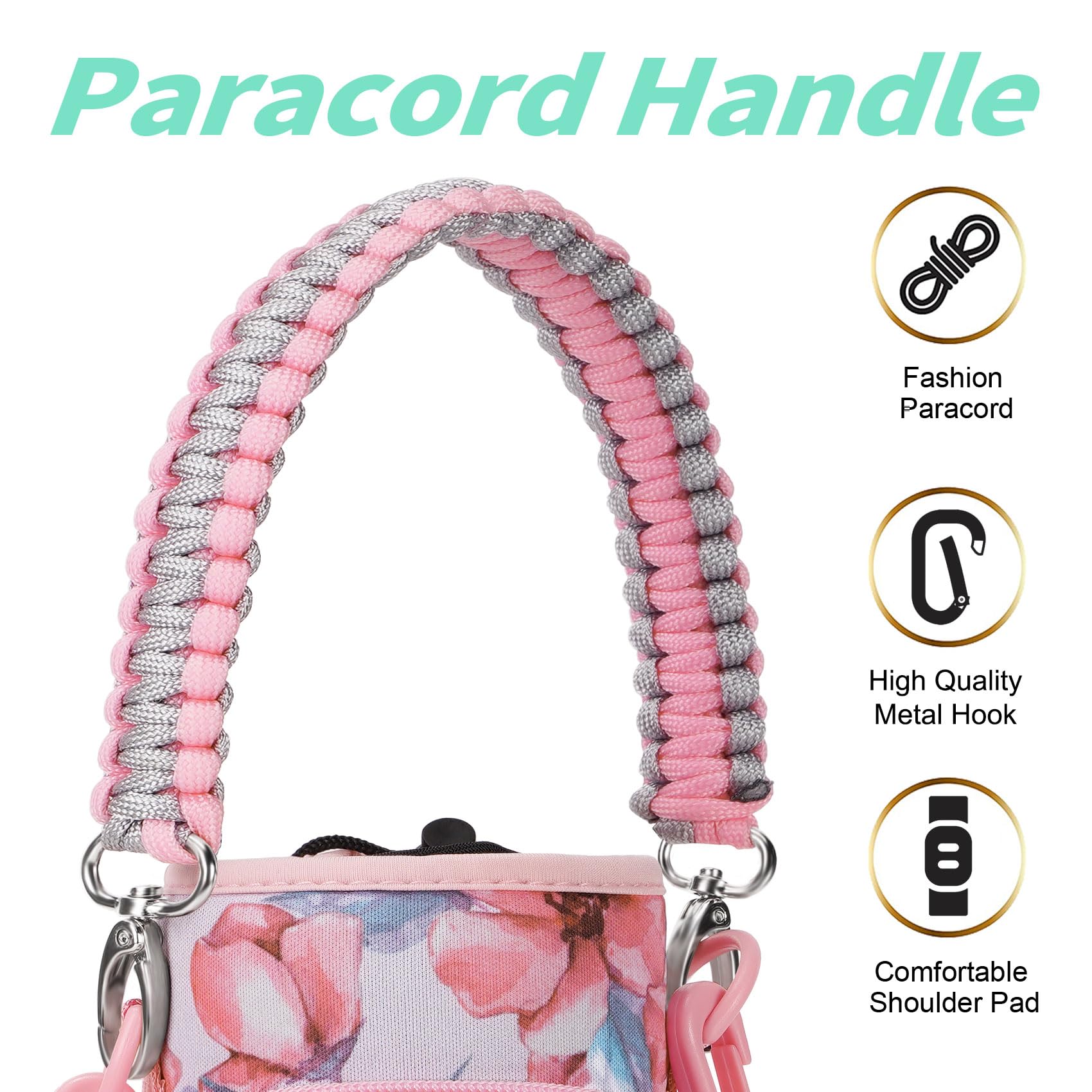 AceTreker Water Bottle Holder with Strap 32oz 40oz Metal Water Bottle Sleeve with 4 Pocket Sport Water Flask Carrier Sling Bag with Paracord Handle for Gym Walking Hiking-Pink Flowers