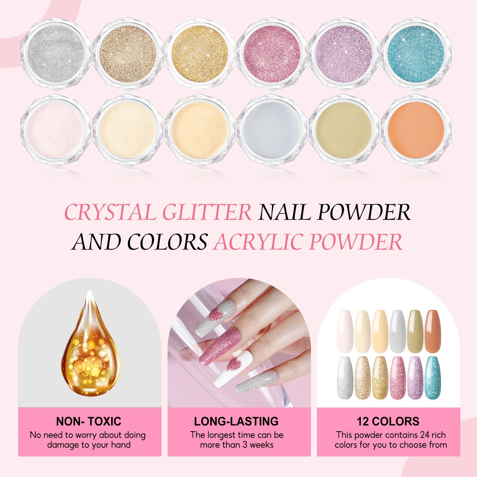 - 【12 Colors Glitter Powder for DIY】Our acrylic nail kit for beginner can help you create sparkling manicure, which includes 12pc glitter powder, nail art rhinestones. You can use nail acrylic powder kit to create nail extensions and carve 3D flowers, or mixed with glitters or sequins and add nail art decorations,make your nails attractive.