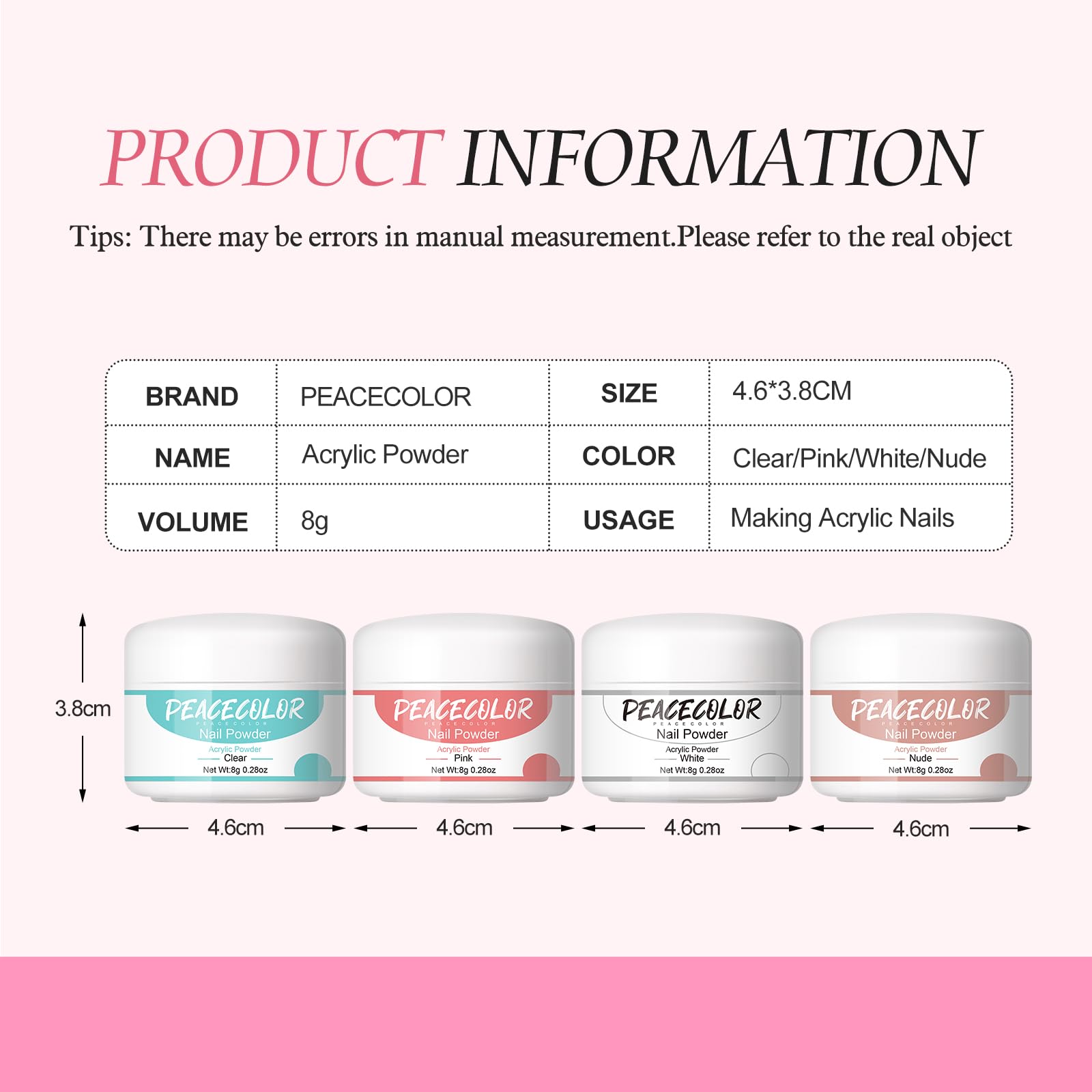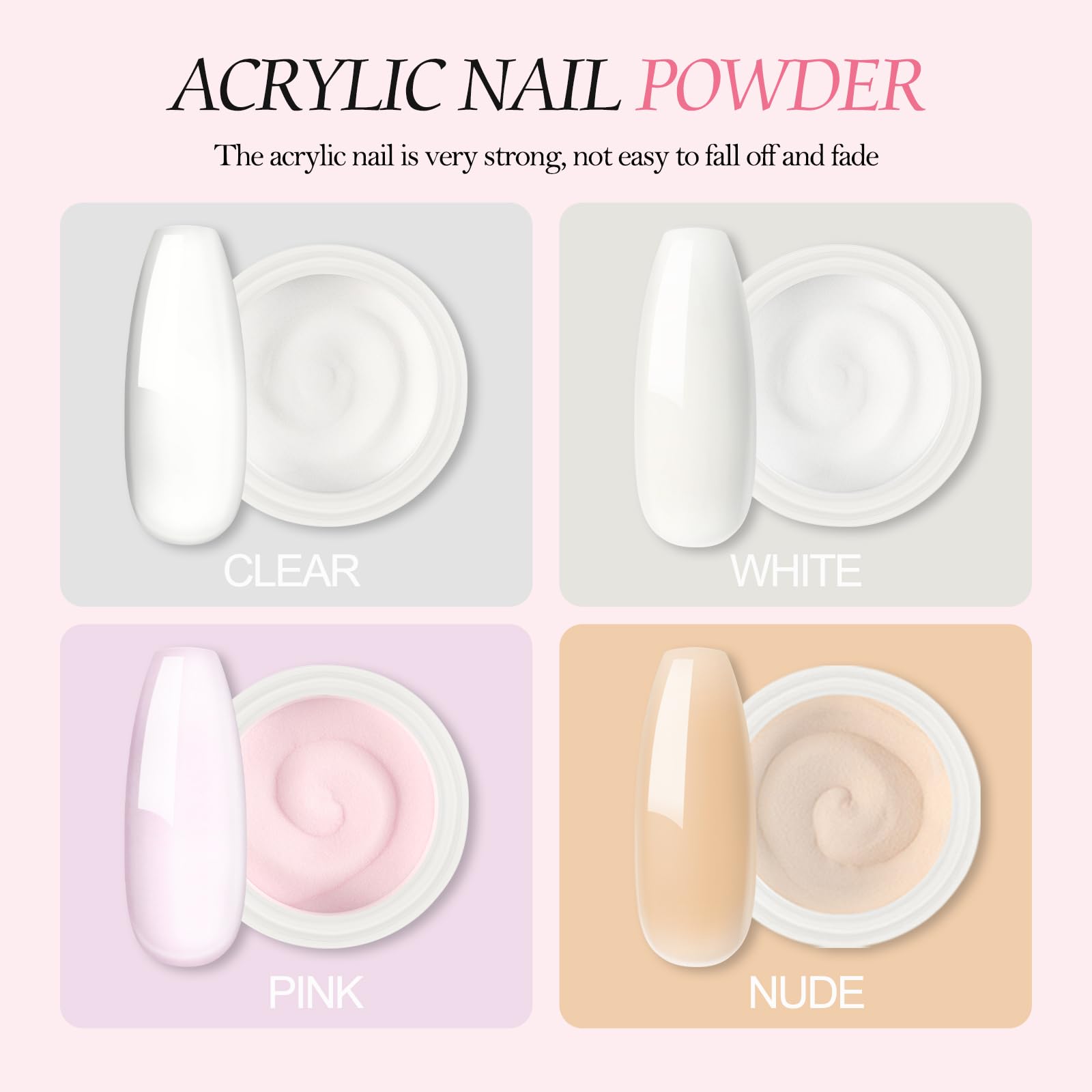 - 【Premium 4 Colors Acrylic Powder】This professional nail kit acrylic set contains 4 colors acrylic nail powder (clear/white/pink/nude). The acrylic powder made of high-quality materials,no yellowing, the adhesion is good. The completed acrylic nails creates a protective layer that keeps you nails stronger. The acrylic powder can be used to make nail carving, nail extension. .