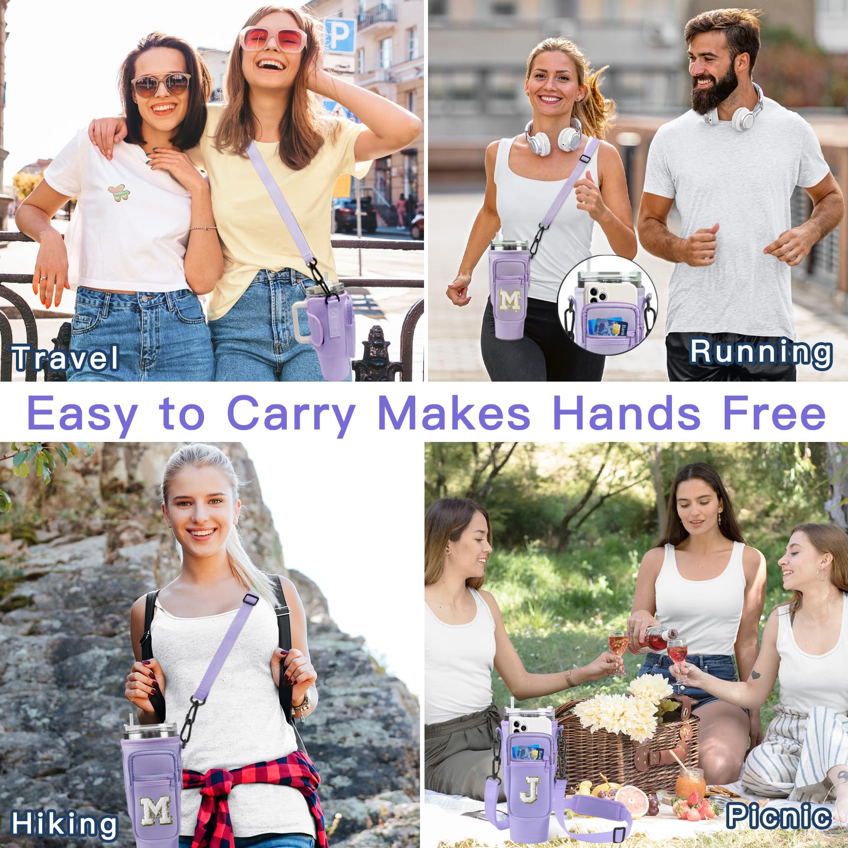 Details: Aganmi Unique Birthday Gifts for Women Teen Girls Her Initial Water Bottle Carrier Bag with Phone Pocket for Stanley 40 Oz Tumbler Stanley Cup Accessories Water Bottle Holder with Strap Purple