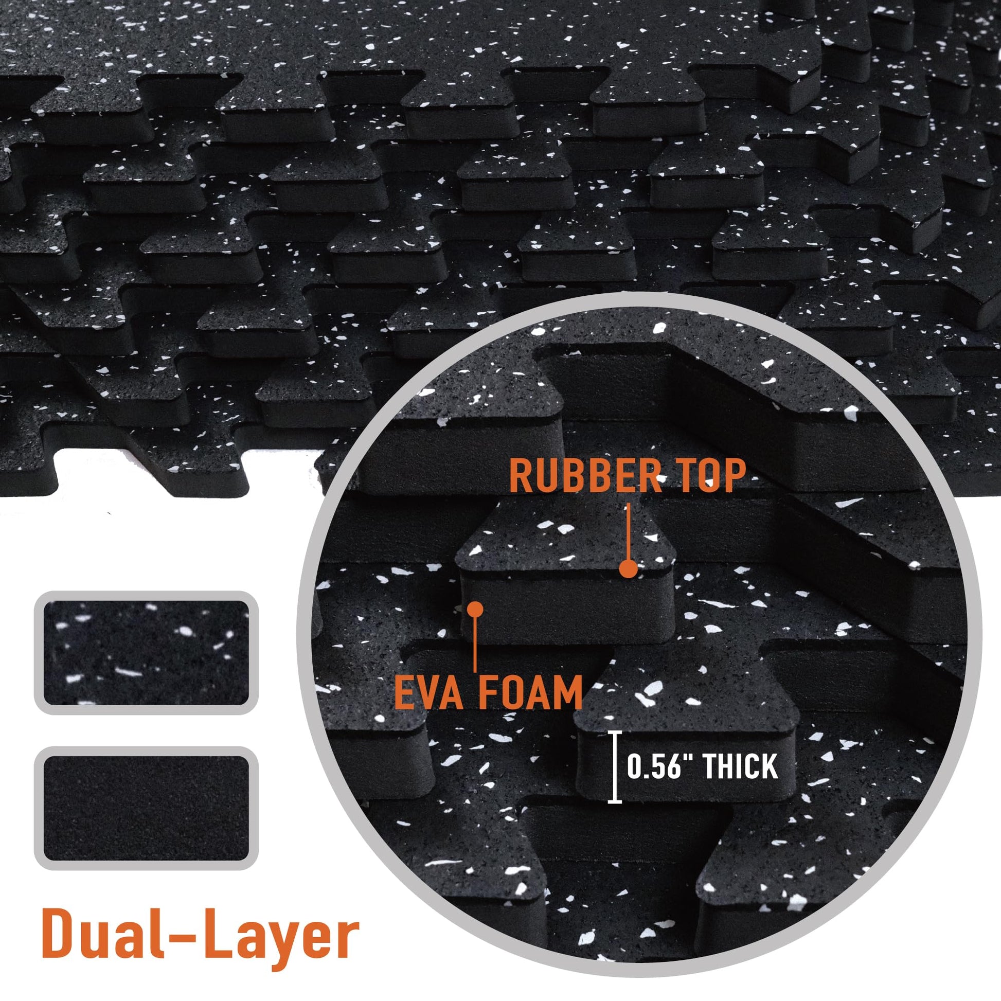 - [Upgraded Dual-Layer Design]: Concerned about your equipment scratching the floor during workouts? Our 2in1 Rubber Top EVA Foam Exercise Gym Mats are crafted to solve this issue. The textured rubber top layer, combined with a high-density EVA foam bottom layer, seamlessly creates a non-slip tough surface with excellent shock absorption.