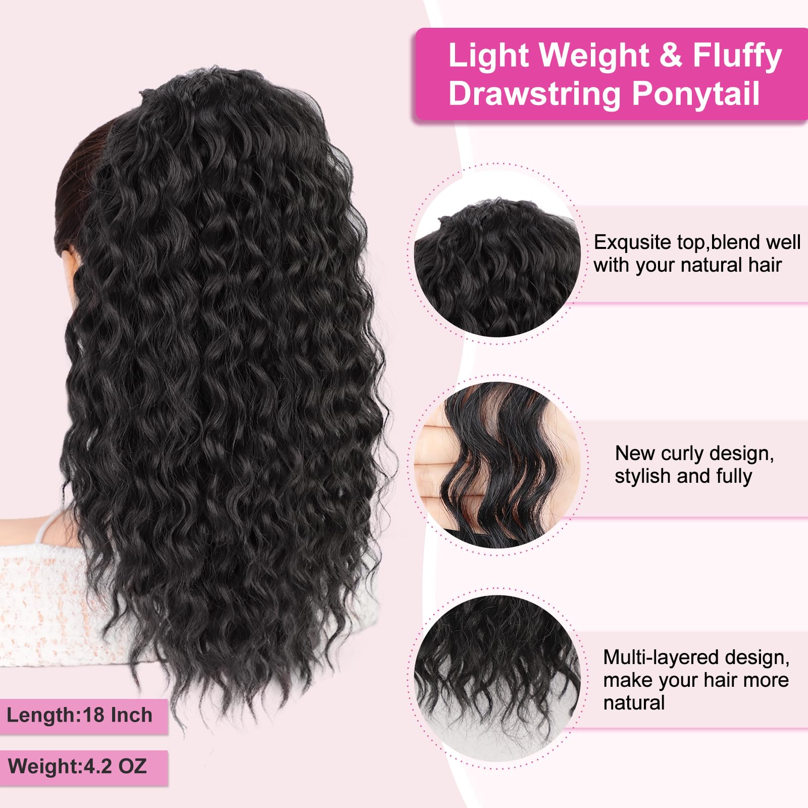 AISI BEAUTY Black Ponytail Extension Curly Drawstring Ponytail for Women Full Fake Ponytail 18 Inch Synthetic Curly Pony Tails Hair Extensions
