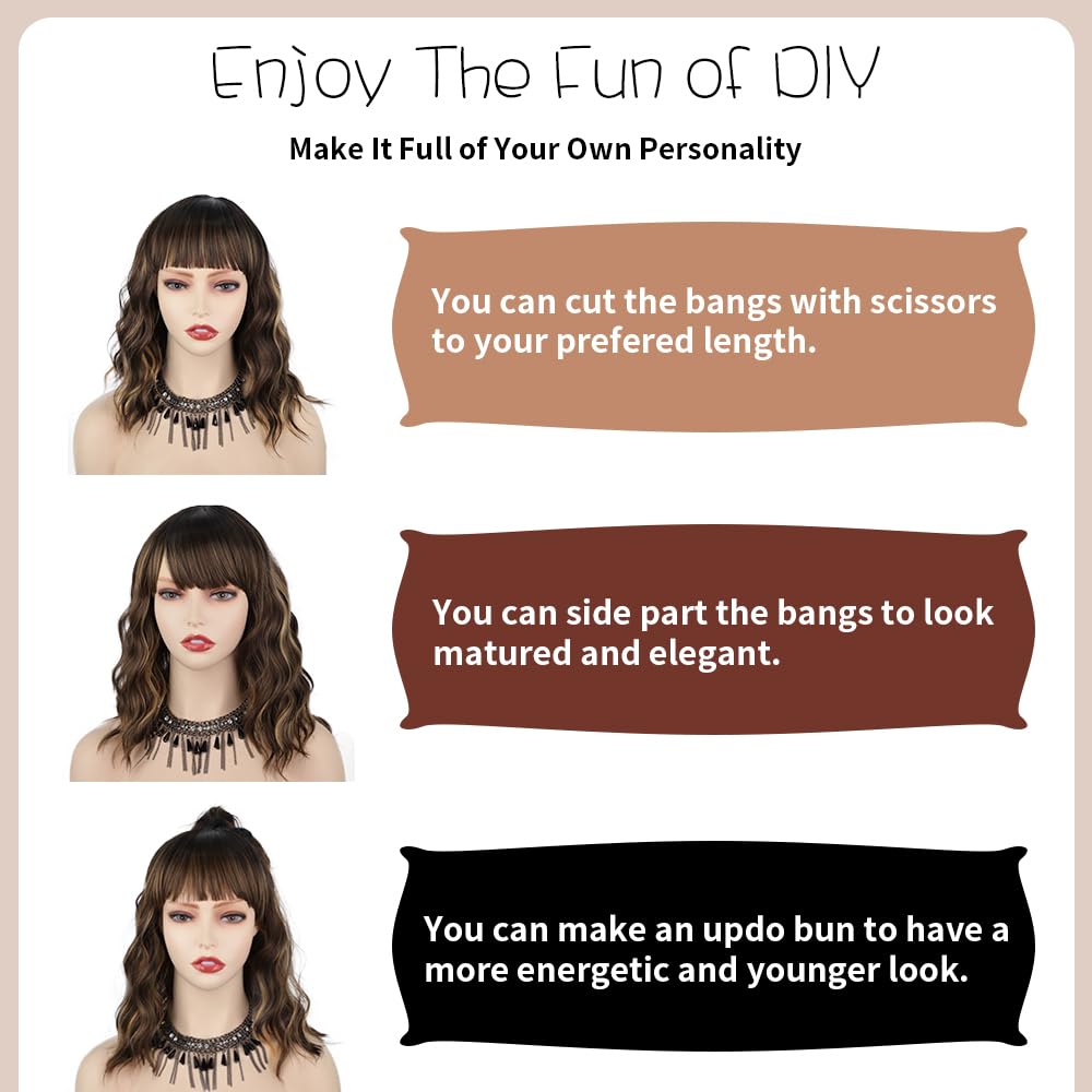 AISI HAIR Synthetic Curly Bob Wig with Bangs Natural Brown with Blonde Highlight Short Wavy Hair for Women Natural Looking Heat Resistant Bob Wigs
