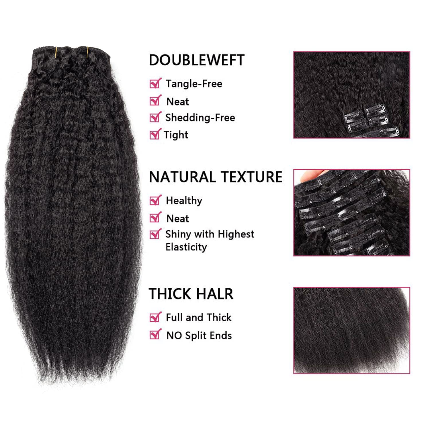 - Hair Texture: Kinky Straight Clip In Human Hair, The Color Is Natural Black, Well Crafted Double Wefts. 120G/Set. 10 Pcs/Set With 22 Clips Attached