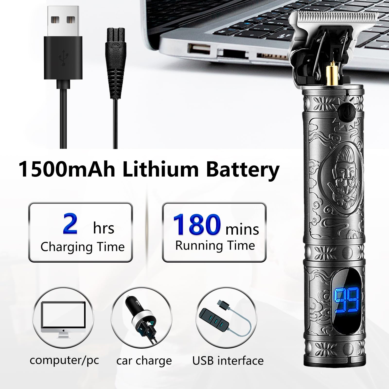 - 【Cordless USB Rechargeable Design】 - 1500mAh Lithium-ion battery delivers over 180 minutes of nonstop run time; charges in just 2 hour. The USB cable can compatible with any USB charger interface .You can walk away from the charger while using maximum mobility and convenience.