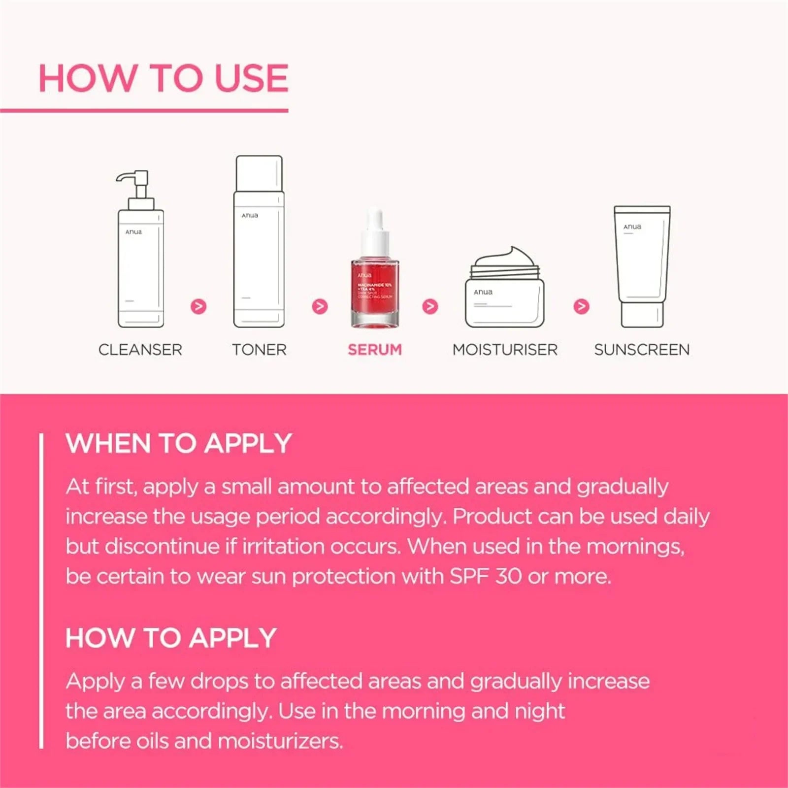 Anua 10% Niacinamide + 4% Hyaluronic Acid Serum, Hyaluronic Acid, Vitamin B12 Natural Pigment, Suitable for Sensitive Skin, 30ml