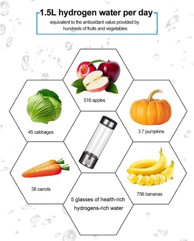 - ๐ถ[Healthy Drinking Water Bottles]Glass Hydrogen Generator contain bio-minerals, which react positively with hydrogen-rich water to remove pollutants in the water, including heavy metals, fluorides and so on. 1.5L of water per day is equivalent to the antioxidant value of hundreds of fruits and vegetables.thereby reducing human aging and enhancing immunity.