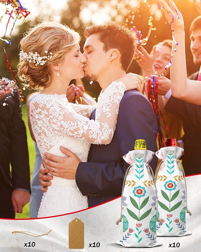 - 🍷GREAT VALUE PACKAGE - Each package includes 10 burlap wine bags with built-in drawstrings, and both come with rectangular gift tags and jute cords, craft paper tags with blank designs, elegant love or wishes. This wine bags set combo will meet all your wine packaging needs. You can hang the tag on the wine storage bag with jute cord attached.
