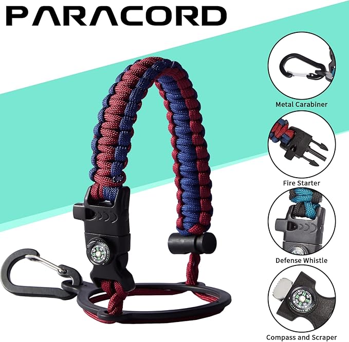 - UNIQUE PARACORD—Perfect Accessories: bright color paracord matches the flask water bottle to give you a youthful vibe while adding a personal style. It comes with a compass, safety loop, metal carabiner, flint, igniter, and whistle to become your survival tool for your wild adventures.