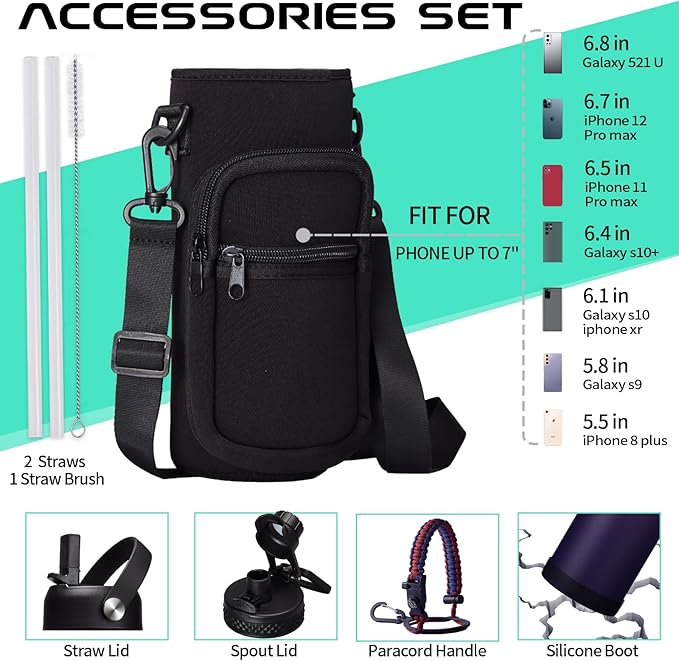 - COMBO—Super Deal: Buy 40oz stainless steel water bottles and get 9 accessories (2 x lids, 1 x survival paracord, 1 x carrying pouch, 1 x shoulder strap, 1 x protective cup mat, 2 x straws, 1 x straw brush). WITH A LIFETIME GUARANTEE, these thermal water bottles are the perfect gift for use at home, work, school, road trips, hiking, sporting events, or just hanging out
