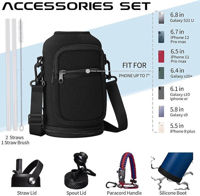 - PROTECTIVE BOOTS & STORAGE SLEEVE: Upgraded silicone boots prevent shattering and cracking when stainless steel water bottle accidental dropped. And storage carrying pouch with removable shoulder strap for convenient hands free carrying! The safe zippered pocket design to stores all your stuff, holds your cards & phone & key