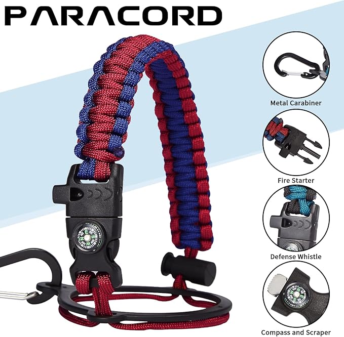 - UNIQUE DESIGNS PARACORD HANDLE: Full-function paracord handle made in individual styles to match the color of the flask water bottles. With compass, safety ring, carabiner, flint fire starter & whistle. It unravels into a sturdy and taut rope in an emergency, making the large water jug an ideal survival kit for expeditions in the wild