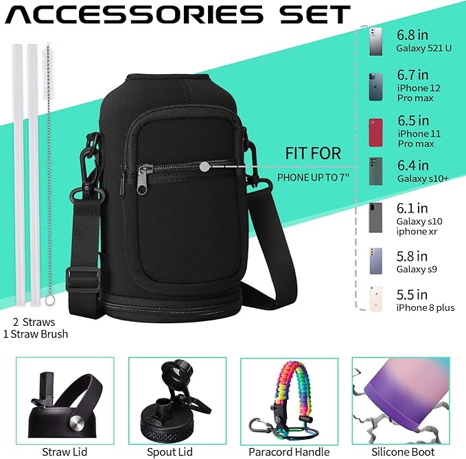 - PROTECTIVE BOOTS & STORAGE SLEEVE: Upgraded silicone boots prevent shattering and cracking when stainless steel water bottle accidental dropped. And storage carrying pouch with removable shoulder strap for convenient hands free carrying! The safe zippered pocket design to stores all your stuff, holds your cards & phone & key