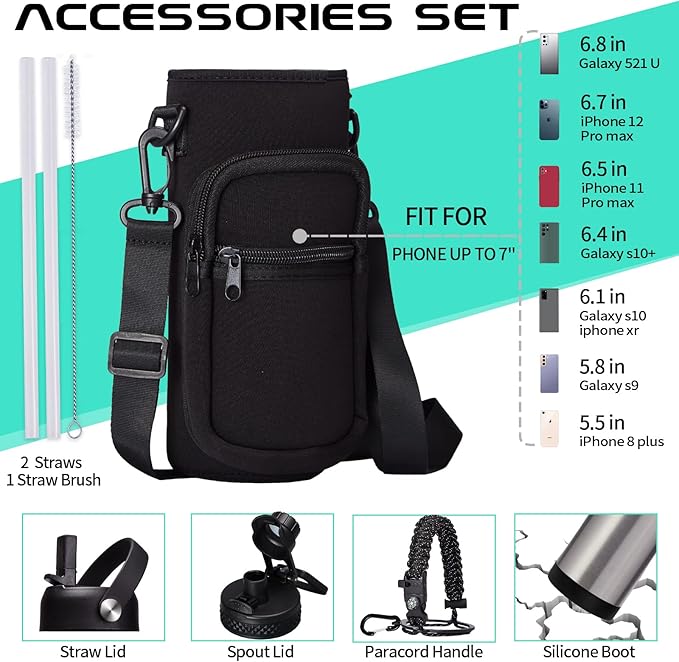 - COMBO—Super Deal: Buy 40 oz water bottle and get 9 accessories (2 x lids, 1 x survival paracord, 1 x carrying pouch, 1 x shoulder strap, 1 x protective cup mat, 2 x straws, 1 x straw brush). WITH A LIFETIME GUARANTEE, these thermal water bottles are the perfect gift for use at home, work, school, road trips, hiking, sporting events, or just hanging out