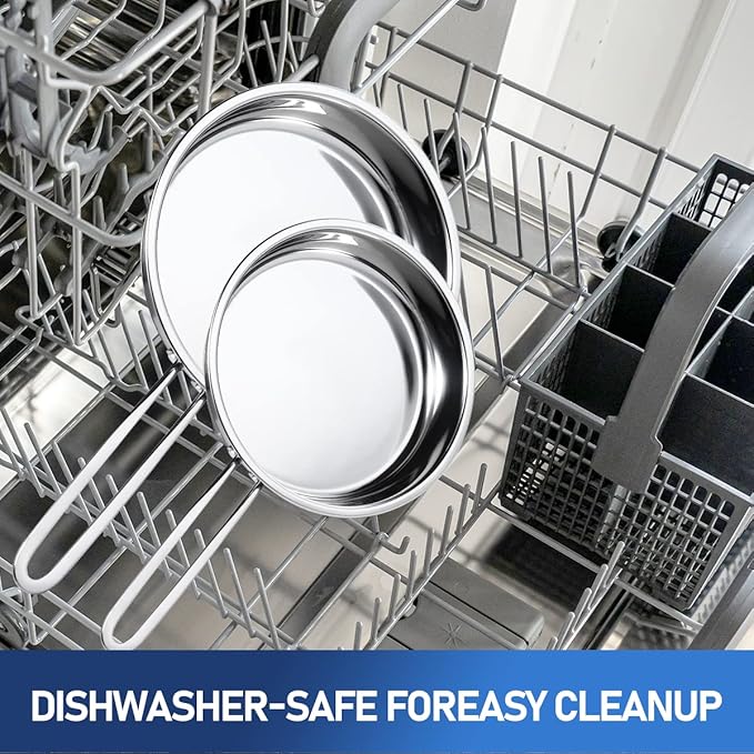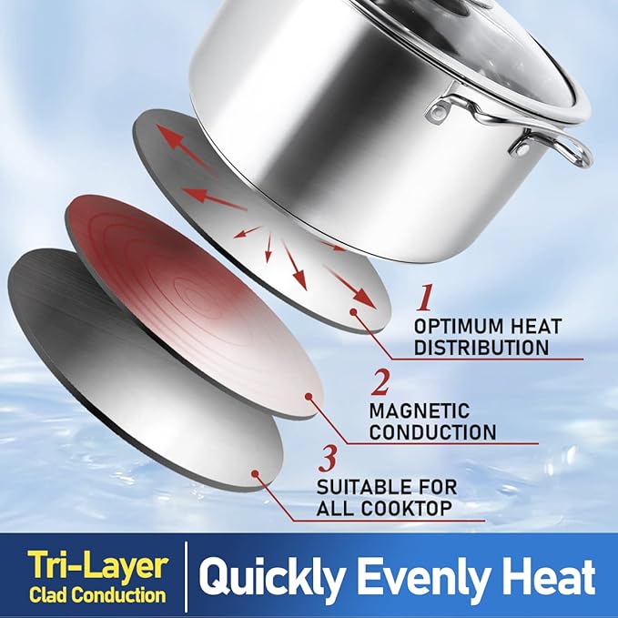 - Built to Last - Our pots and pans boast a 3-ply premium stainless steel base with a thick aluminum core for even heat distribution and outstanding durability. Non-toxic and resistant to discoloration, this cookware won't react with food or affect flavors, ensuring safe and healthy meals. Experience faster cooking with reduced hot spots that can burn food, saving both time and energy!