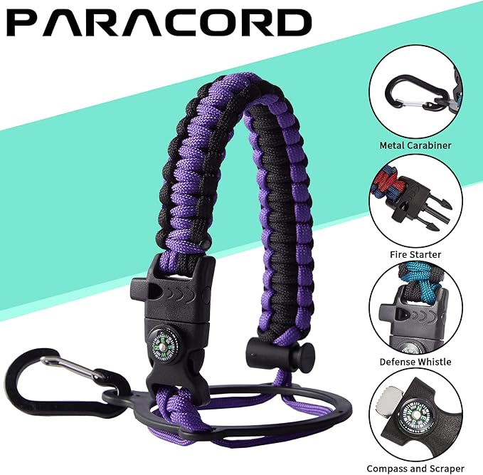 - UNIQUE PARACORD HANDLE: Bright color paracord matches the flask water bottle to give you a youthful vibe while adding a personal style. With a compass, safety loop, metal carabiner, flint, igniter and whistle to become your survival tool, making the 32 oz stainless steel water bottle with paracord an ideal survival kit for expeditions in the wild