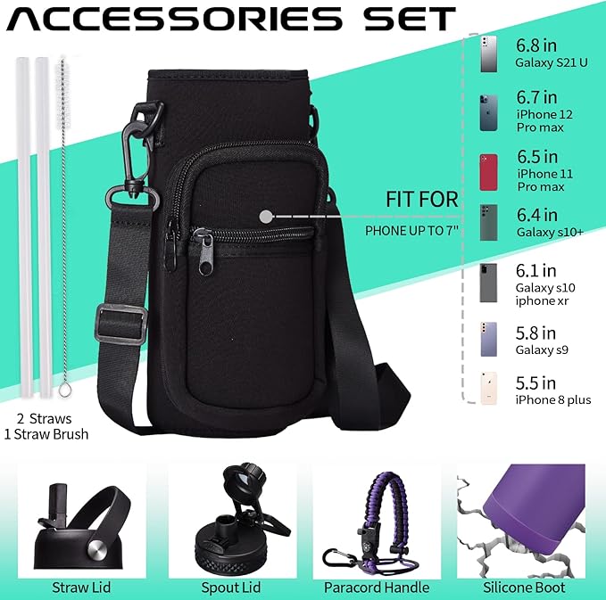 - SUPER JOYFUL COMBO: Buy 32 oz water bottles and get 9 accessories (2 x lids, 1 x survival paracord, 1 x carrying pouch, 1 x shoulder strap, 1 x protective cup mat, 2 x straws, 1 x straw brush). WITH A LIFETIME GUARANTEE, these thermal water bottles are perfect gifts for using at home, work, school, road trips, hiking, sporting events, or just hanging out
