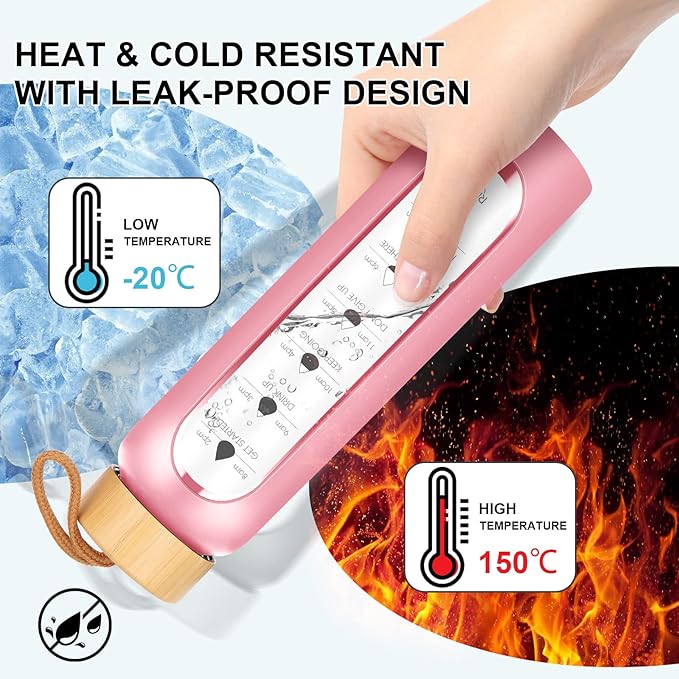- [Your Ultimate Hydration Partner]: Our clear glass drinking bottle are made of borosilicate glass, which is dishwasher safe, leak proof, BPA, BPS, PVC, lead, and cadmium free. These durable and aesthetic reusable glass time water bottles will not crack under extreme temperature and pressure.