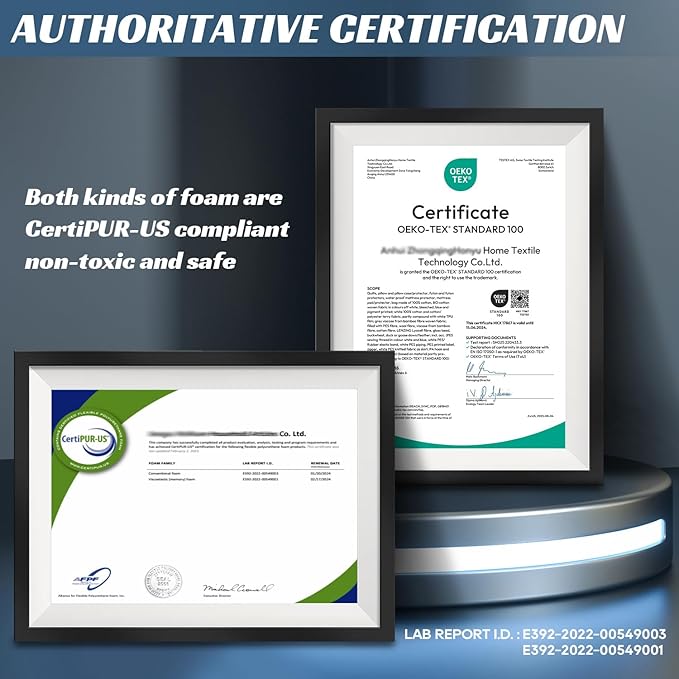 - Certi-Pur Certified Memory Foam: The top layer gel memory foam provides a firm feel for optimal support and is certi-pur US certified (E392-2022-00549001). CertiPUR-US certified memory foam is healthier and more suitable for after surgery.