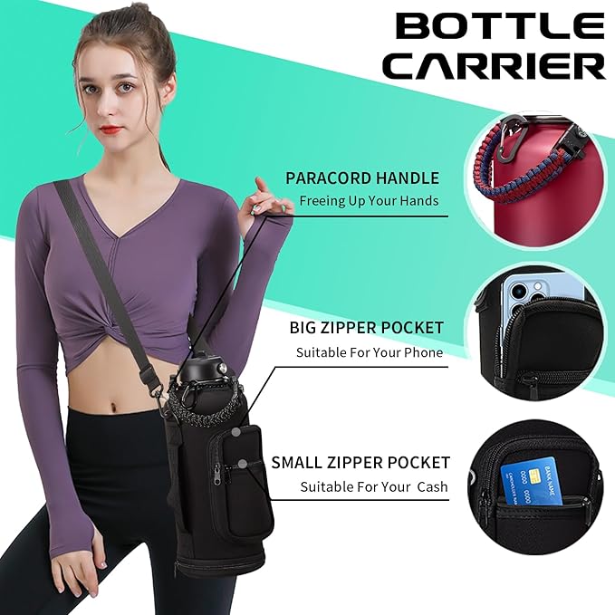 - PROTECTIVE BOOTS & STORAGE SLEEVE: Upgraded silicone boots prevent shattering and cracking when stainless steel water bottle accidental dropped. And storage carrying pouch with removable shoulder strap for convenient hands free carrying! The safe zippered pocket design to stores all your stuff, holds your cards & phone & key
