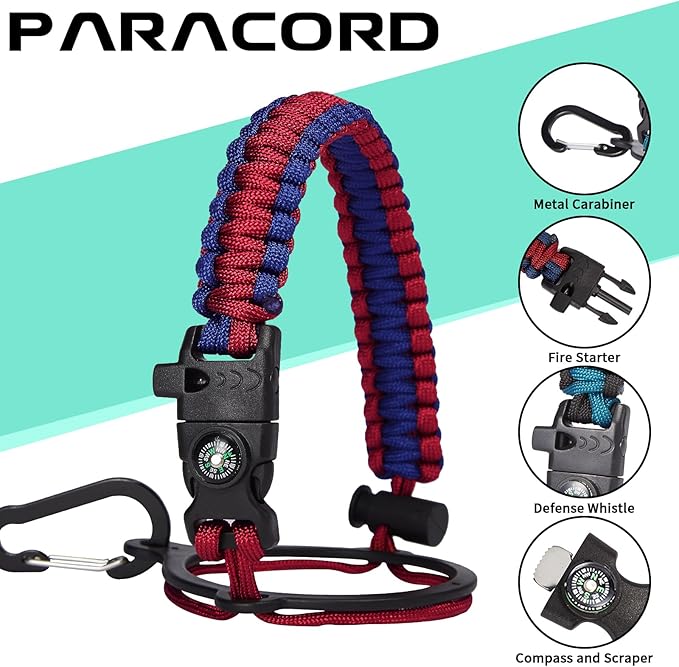 - UNIQUE DESIGNS PARACORD HANDLE: Full-function paracord handle made in individual styles to match the color of the flask water bottles. With compass, safety ring, carabiner & whistle. It unravels into a sturdy and taut rope in an emergency, making the large water jug an ideal survival kit for expeditions in the wild