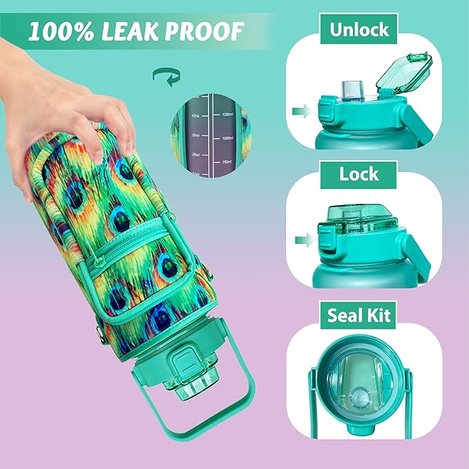 64 oz Water Bottle with Straw Sleeve & Strap Motivational Half Gallon Water Jug with Handle for Gym Women Men Aesthetic Water Bottle with Strap Peacock Feather