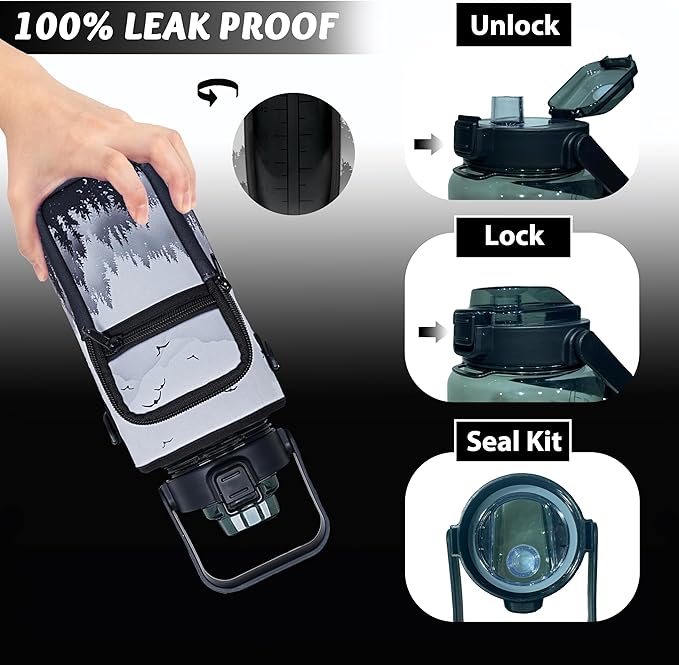 - [64 oz Water Bottle with Straw]: Our 64-ounce hydration bottle is designed to motivate and inspire you to reach your daily water intake goals. It is equipped with a food-grade sealing ring and a one-handed safety lock to prevent any leaks. Press the button to use the straw and enjoy quick water flow without spilling on-the-go. The water jug has a wide mouth design that allows easy addition of fruit and ice cubes, making cleaning effortless.