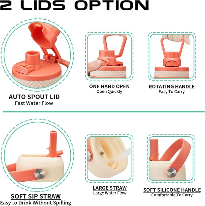 - 2 LID OPTIONS (Auto-spout & Straw): two different lids are complete LEAK PROOF & design for easy drink. The pops-up lid for easy drinking and seals shut for no leaks when you're on the go. The straw lid makes it easy to enjoy spill-proof sips, and package come with a alternative straw & a straw brush for easy cleaning