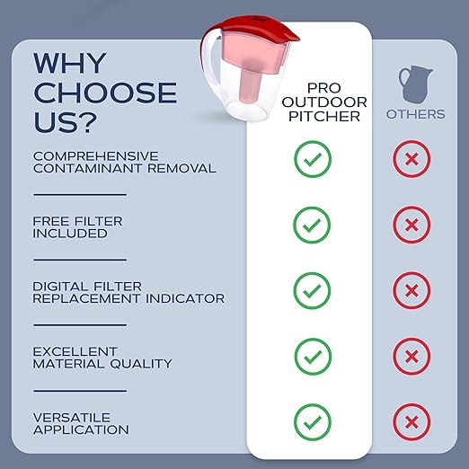 - STAY HYDRATED, STAY HEALTHY: Invest in a water purifier that not only provides great-tasting water but also ensures your well-being. Keep yourself and your loved ones hydrated and healthy with the Pro Outdoor Filtered Water Pitcher for Drinking Water. Make every sip count!