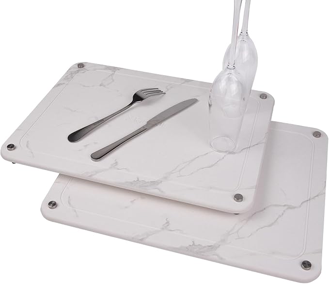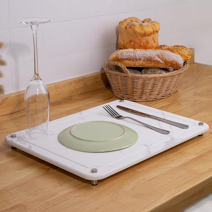 - Sustainbility: The stone dish drying mat shows our care for the environment. Made from natural diatomaceous earth, it comes in a modern marble white color that fits any decor. This stylish, eco-friendly stone drying mat for kitchen counters is great for drying dishes or placing under pet bowls.