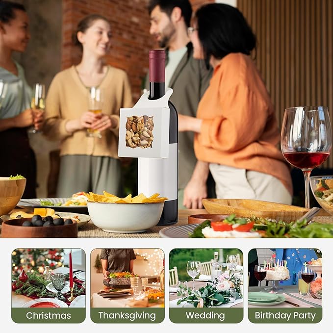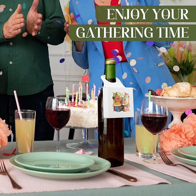 • UNIVERSAL SIZE - Wine bottle hanging boxes are 3.5 x 3.5 x 1.2 inches / 9 x 9 x 3 cm in size, and the hanging hole size is 1.5in / 3.8cm. Thick kraft paper material makes candy box with window durable and easily to hang on various size glass bottles such as champagne ,prosecco, beers, and also plastic bottles like soda and water bottle.