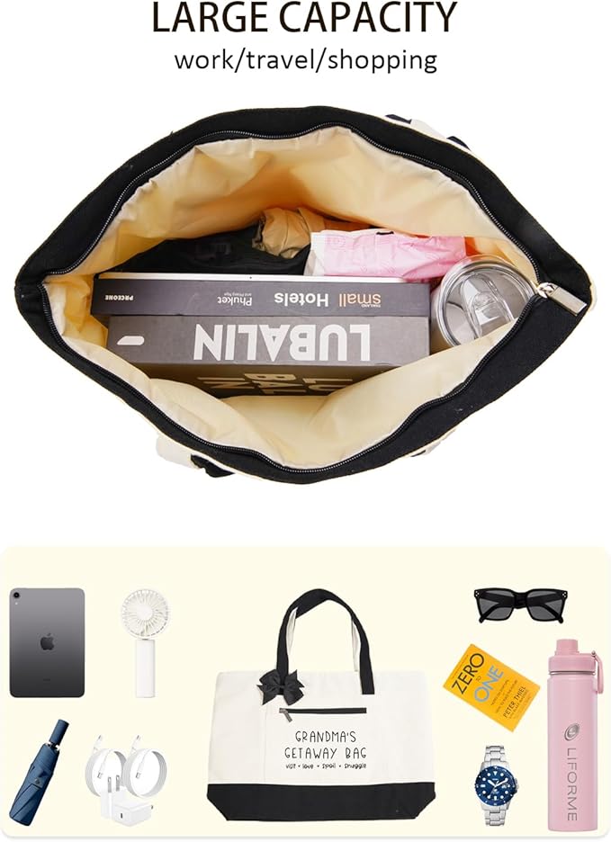 - Large Capacity for Multiple Use: This large size tote bag (17.7' x 13.7' x 3.9') is perfect for Grandma to hold groceries, clothes, shoes, snacks, a laptop, magazines, and other daily essentials. Grandma can take our getaway bag to various occasions, such as work, weekends, beach trips, weddings, bridal showers, vacations, camping, office use, yoga sessions, library visits, and grocery shopping.