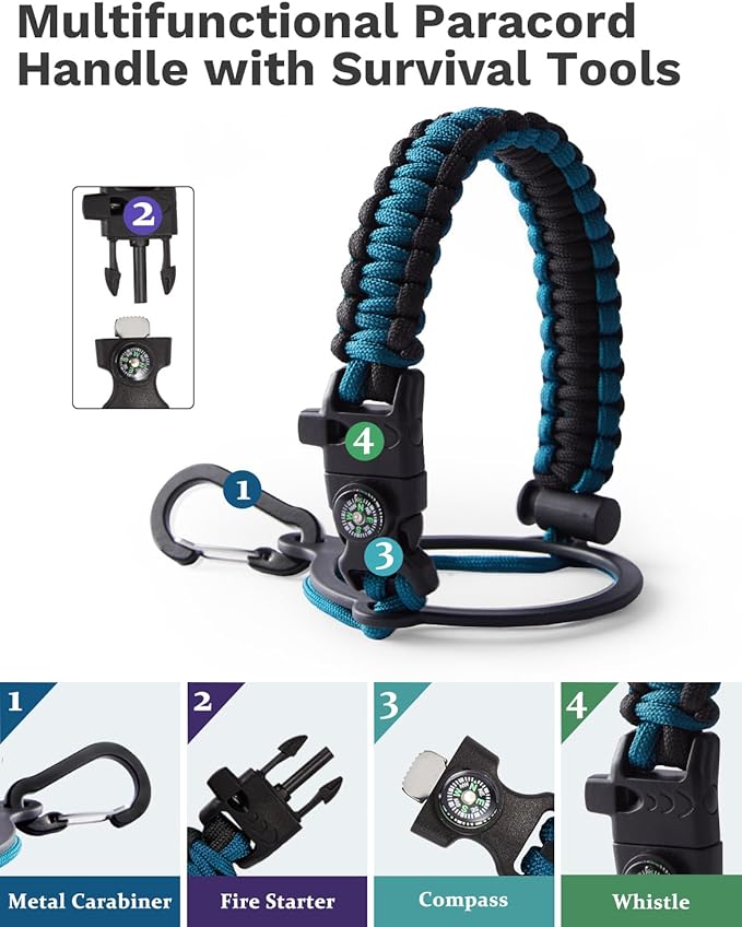 - READY FOR ADVENTURE:The nylon paracord on the bottle gives you more choices in terms of colour coordination and comfort on your hands compared to the handle lids.The paracord handle is made from sturdy braided rope with a survival kit attached. This includes a compass, safety loop, metal carabiner, flint, whistle and clip, making it the ideal companion for any outdoor activity.