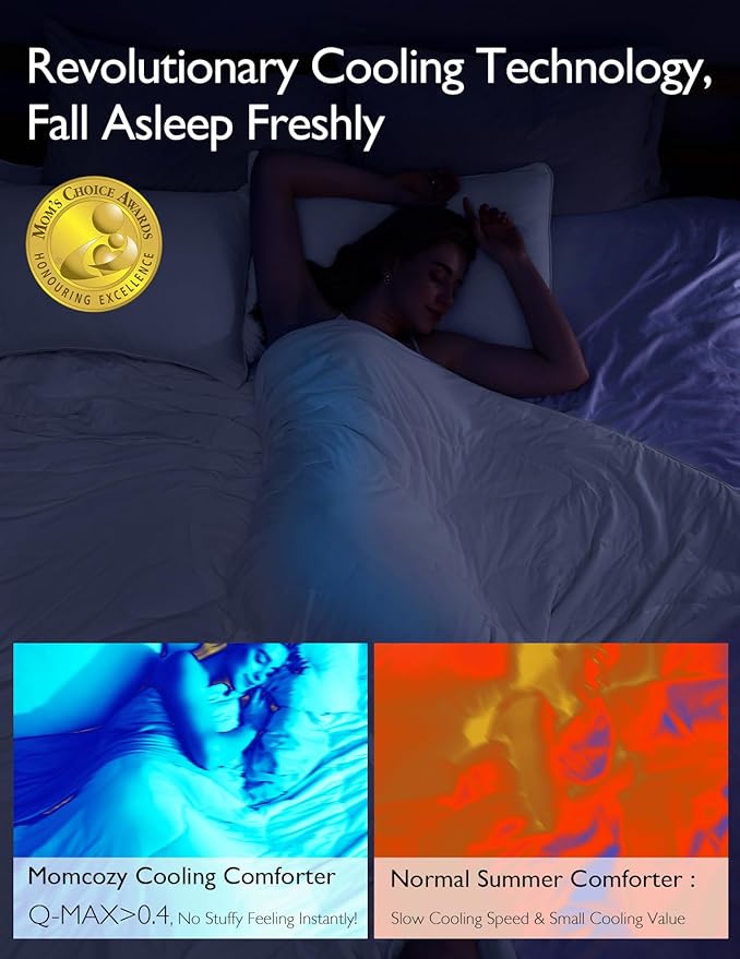 - 【OEKO Certified and Award-Winning Cool】 Momcozy won Mom's Choice Awards, Best of the Pump Awards, and Best of CNET with trusted products that make parenting more convenient and comfortable for families. Momcozy's cooling comforter excels as always. Meets OEKO standard 100 and achieves exceptional natural coolness with fibers five times finer than silk and advanced knitting technology, there is no any nanoparticles.