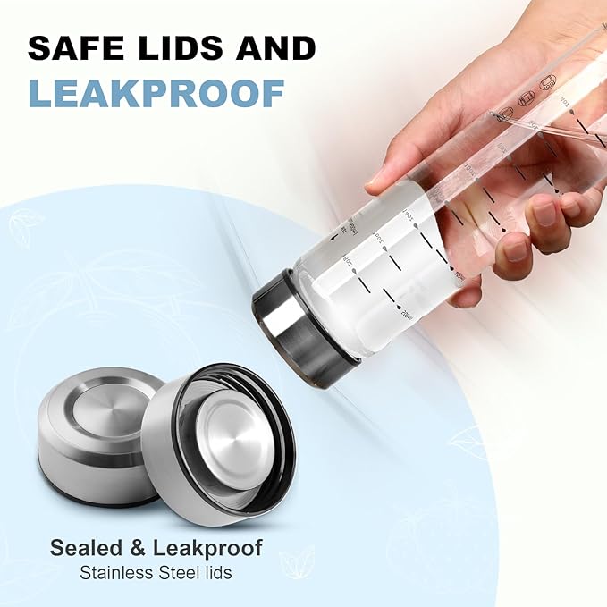 - [LEAK PROOF & AIRTIGHT STAINLESS STEEL LIDS] Our glass bottles feature airtight stainless steel lids that keep liquids securely sealed, each cap is lined with a rubber O-ring so it will never leave a leaky mess in your car or bag. Oxygen can’t get in to break down the enzymes and ruin your juices.