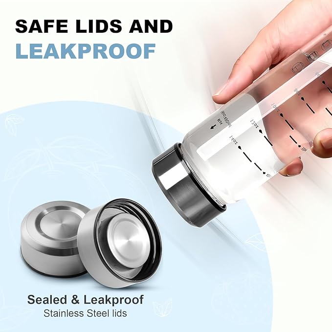 - [LEAK PROOF & AIRTIGHT STAINLESS STEEL LIDS] Our glass bottles feature airtight stainless steel lids that keep liquids securely sealed, each cap is lined with a rubber O-ring so it will never leave a leaky mess in your car or bag. Oxygen can’t get in to break down the enzymes and ruin your juices.