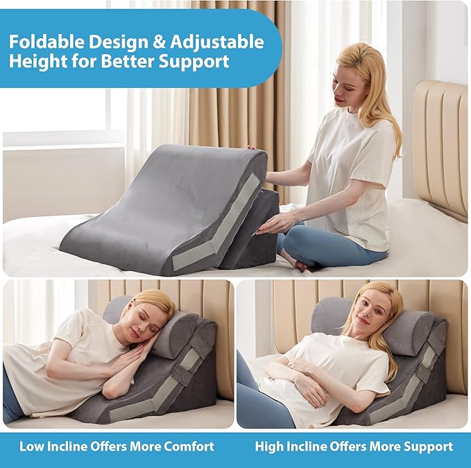 - 【Comprehensive Health Improvement】Our elevated pillow is designed to enhance sleeping quality and overall well-being across various health needs. It effectively alleviates pain in the shoulders, neck, back, spine, and legs as a body positioner. Moreover, the incline pillow aids in post surgery recovery, relieves symptoms of acid reflux, GERD, and heartburn, addresses snoring, promote blood circulation and breathing, and provides pregnancy support.