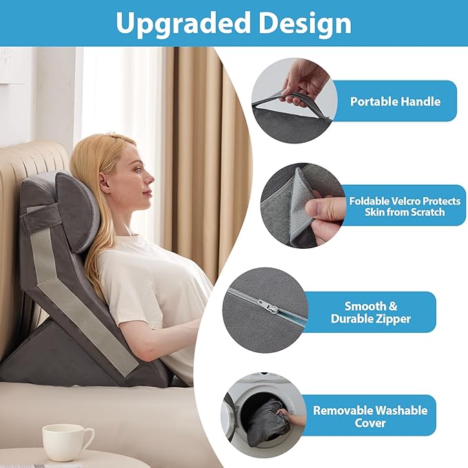 - 【Washable Cover & Portable Handle】Our 3pcs wedge pillow set features a breathable and skin-friendly knitted air layer fabric cover, promoting airflow for a cool sleep experience. The removable cover with a hidden zipper is machine washable for easy maintenance. Wide and foldable velcro sewn on the side allows for various customizable combinations. Designed for convenience, it includes a carry handle for portability, making it ideal for home use and travel.