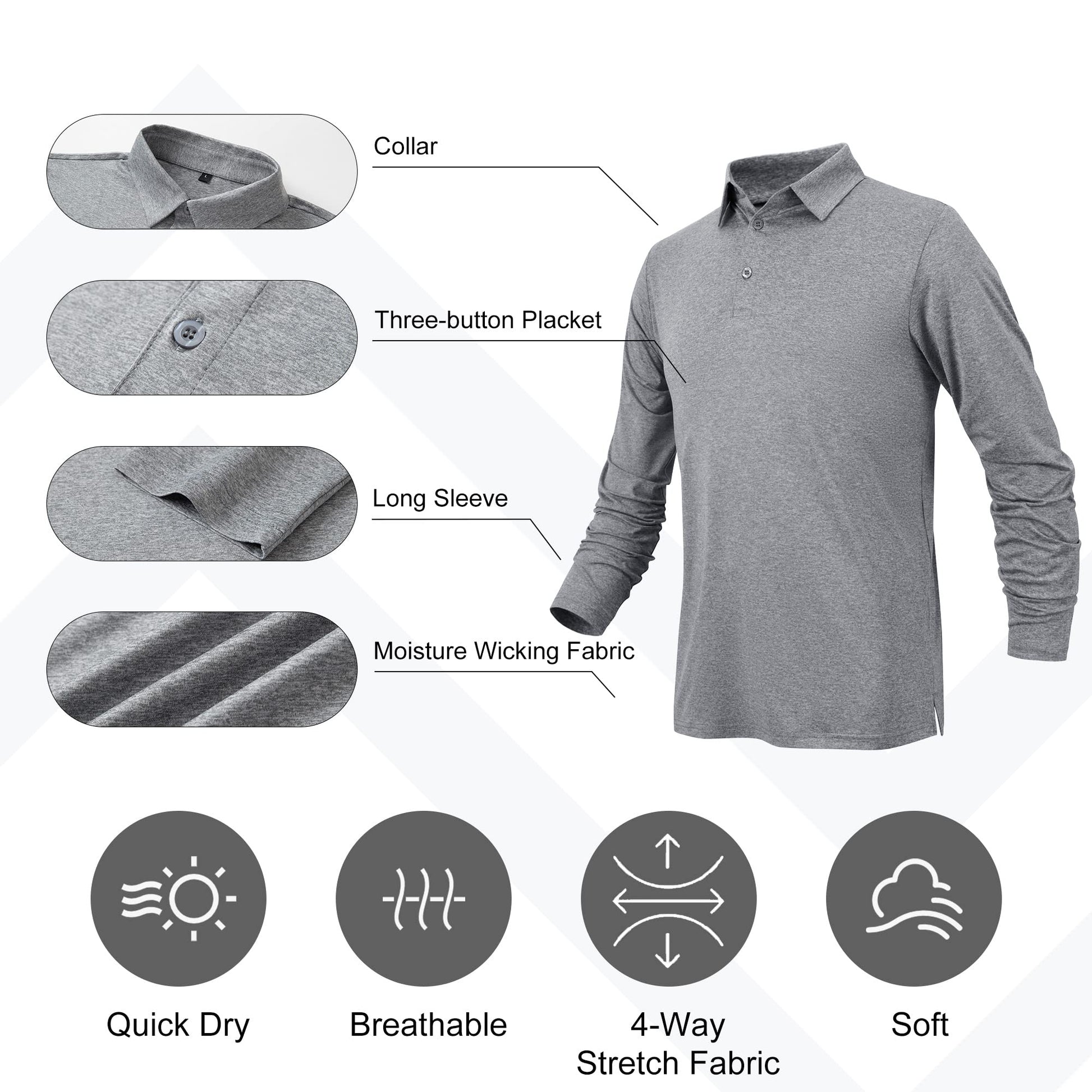 - Design: Classic long sleeve polo shirts with three-button placket and spread collar, features Sweat-wicking material that pulls moisture away from the body to keep you cool and dry