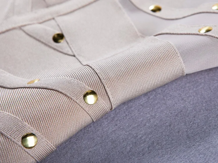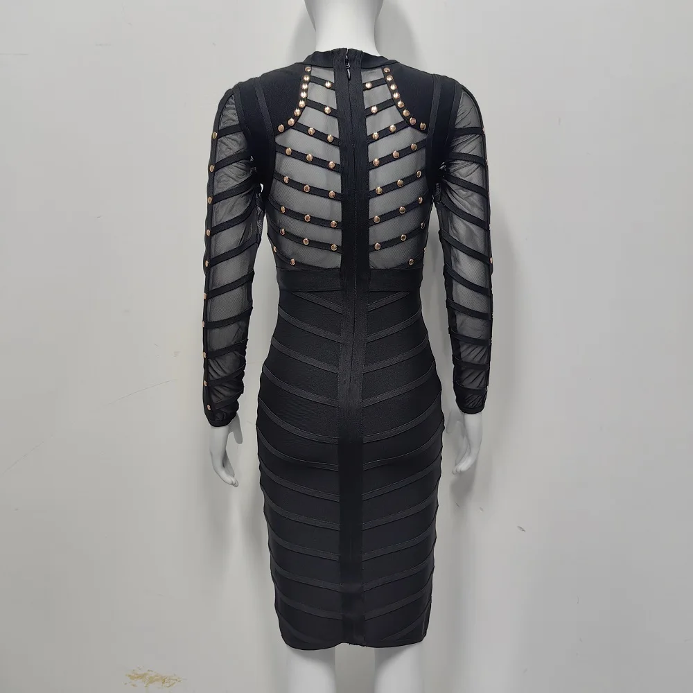 BEAUKEY Sexy Black Khaki Rivet Bandage Dress 2022 For Women Mesh See Through Nail Beaded Long SLeeve Bodycon Party Vestidos XL