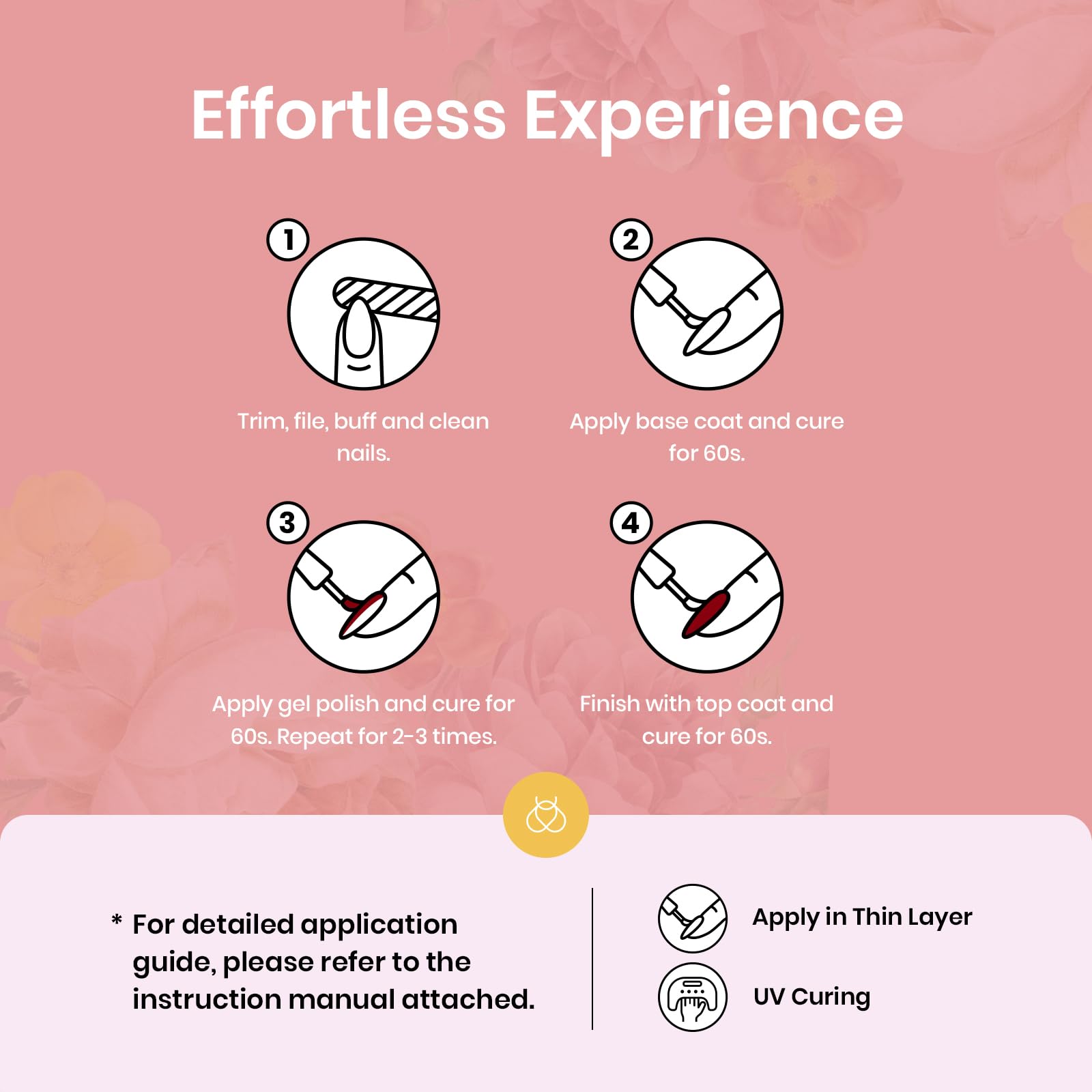 - 【Warning】: May cause an allergic reaction by skin contact. Read directions for use carefully. Professionally formulated and only used for nails. Avoid contact with eyes, mouth, and skin. In case of contact with them, rinse immediately with water. If there is any incident, contact the doctor immediately. Stop using the product if redness and itching develop. Keep out of the reach of children.